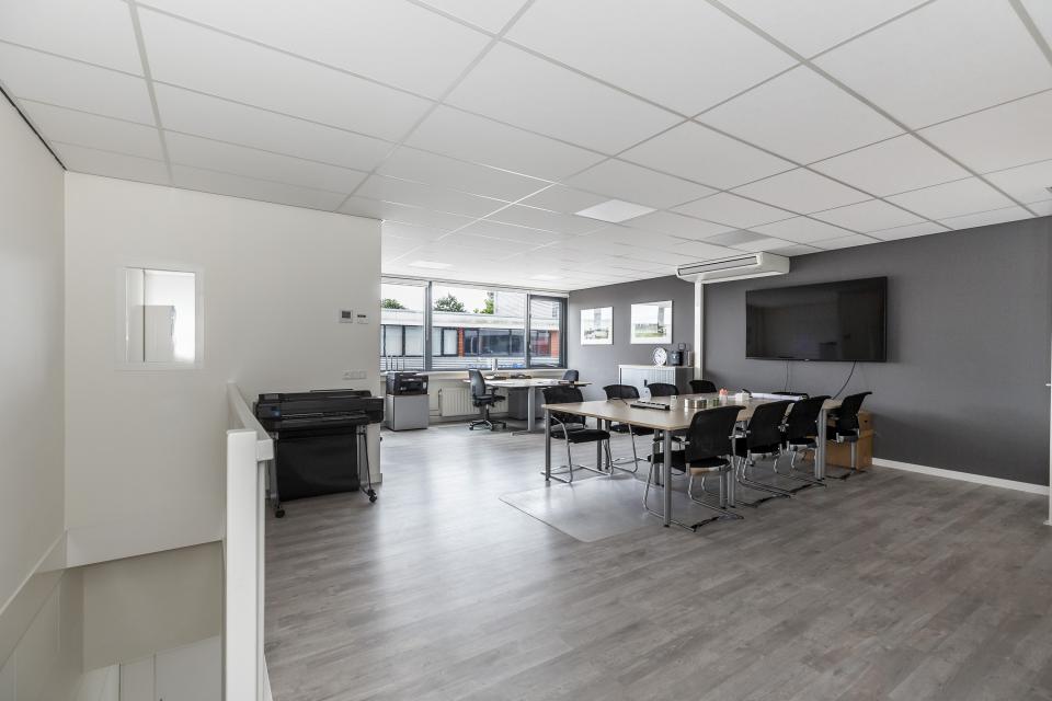 Via de loopdeur komt u een halletje waar de meterkast zich bevindt en waar u enerzijds naar de afgesloten bedrijfsruimte kunt of anderzijds middels de trap naar de kantoorruimte op de eerste verdieping. De bedrijfsruimte is als vanzelfsprekend ook via de overheaddeur (3m. x 3,4 m.) te betreden en is voorzien van een toilet, verlichting en verwarming. Thans bestaat de bedrijfsruimte op de begane grond uit één grote ruimte. De op de foto afgebeelde houten opslagruimte is derhalve niet meer in het pand aanwezig. Er is sprake van een courante vrije hoogte voor een uitstekende werk en/of opslagplaats.Kantoorruimte 1e verdieping