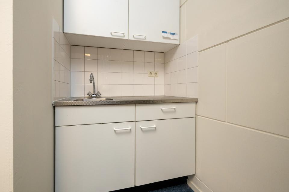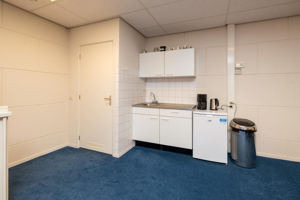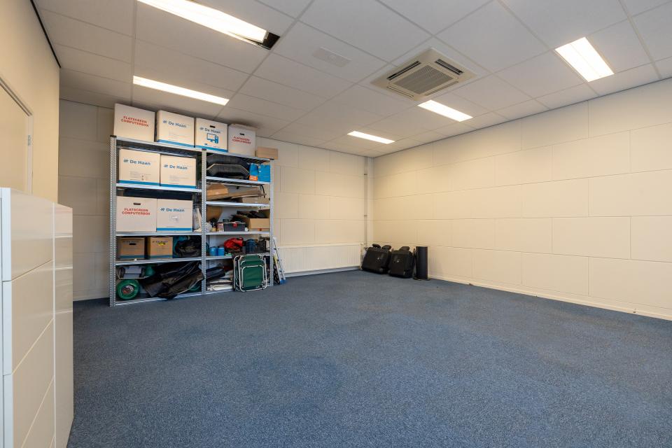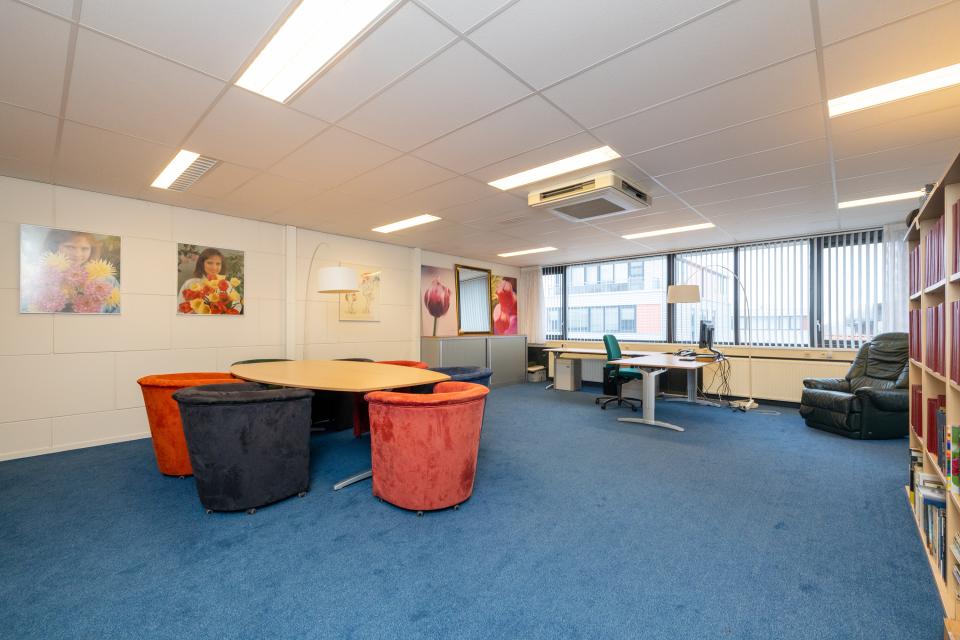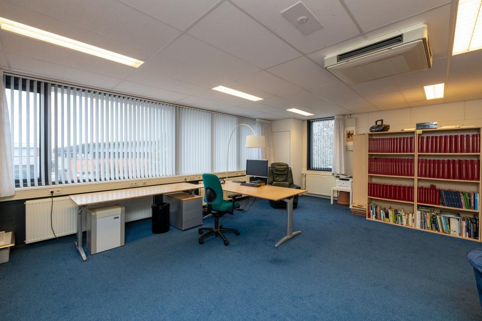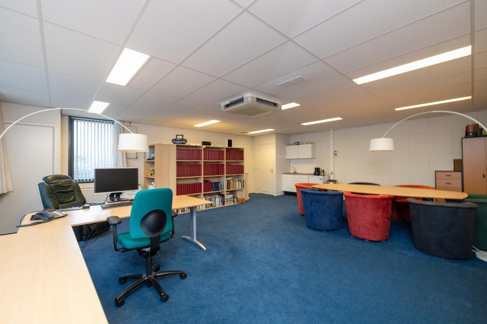 Door de afgesloten trapopgang en de voorzieningen op de eerste verdieping is de kantoorruimte in principe separaat van de begane grond te gebruiken. De ruimte heeft over de volle breedte ramen waardoor er een aangenaam werkklimaat ontstaat. Verder is de ruimte voorzien van een systeemplafond met verlichting, een kabelgoot, een radiatorverwarming, een pantry, toilet, airconditioning en een raam in de zijgevel wat voor extra daglicht zorgt. Ook de verdieping is voorzien van een vloerbedekking. De c.v. ketel is in een kast op deze verdieping gemonteerd.