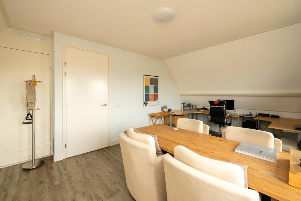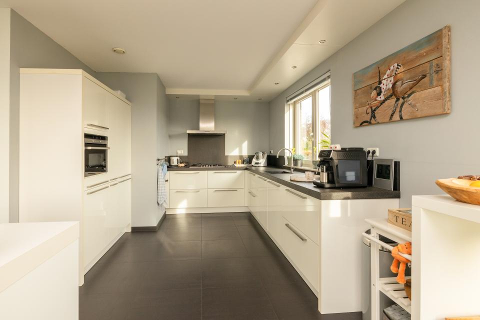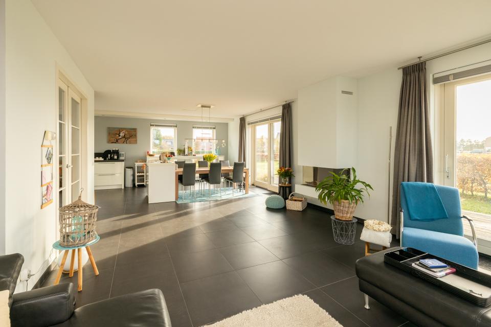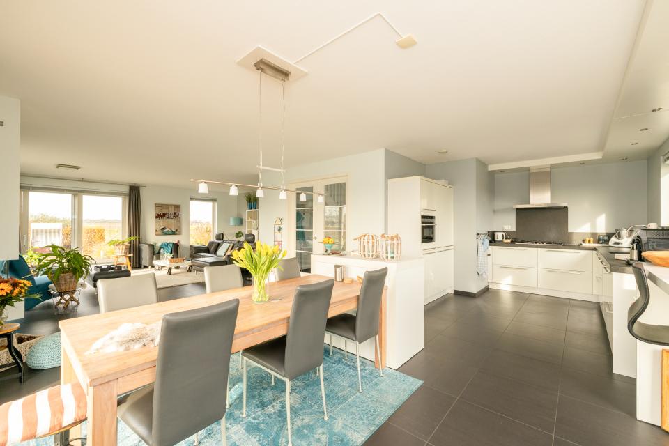 De ruime en lichte woonkamer heeft grote raampartijen die zorgen voor veel daglichttoetreding en een prachtig uitzicht over de omliggende bollenvelden. De sfeervolle gashaard vormt het centrale punt van de woonkamer. De ruimte staat in open verbinding met de keuken, die is ingericht met diverse inbouwapparatuur, waaronder een vaatwasser, oven/magnetron, koelkast, vriezer, afzuigkap en 5-pits gasfornuis.