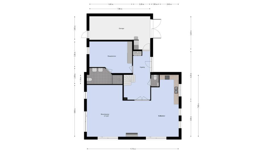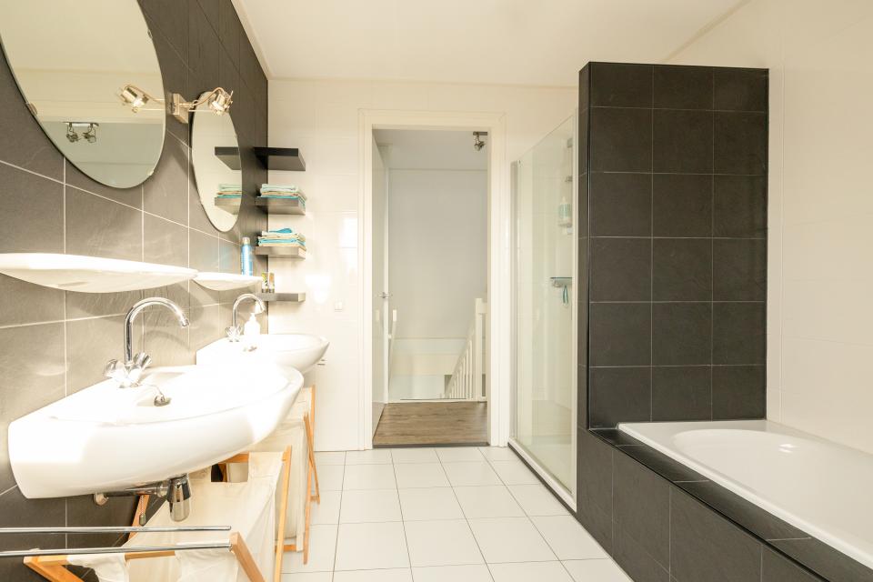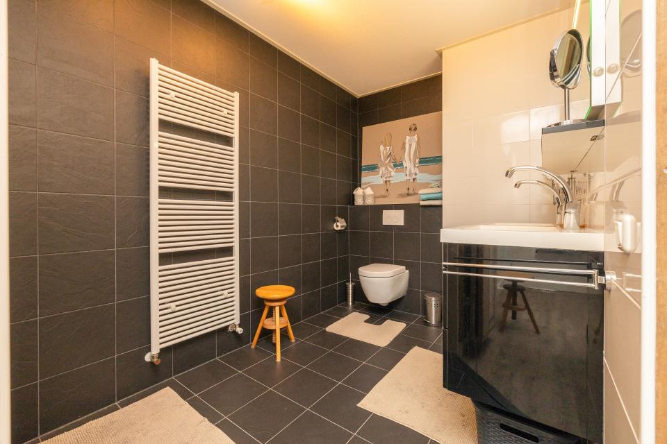 Op de begane grond bevindt zich tevens een slaapkamer met en-suite badkamer, uitgerust met een inloopdouche, dubbele wastafel en toilet. Deze slaapkamer biedt een uitstekende mogelijkheid om gelijkvloers te wonen, of kan dienen als logeerkamer e/o kantoorruimte aan huis. Aansluitend aan de woning heeft u de beschikking even een aangebouwde garage (ca. 25 m²), welk voorzien is van elektra, wateraansluiting en vloerverwarming. Hier bevinden zich tevens de aansluitingen voor wasmachine en droger.