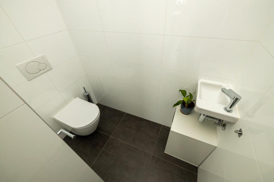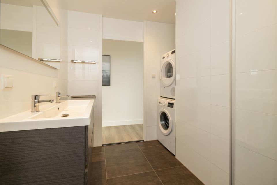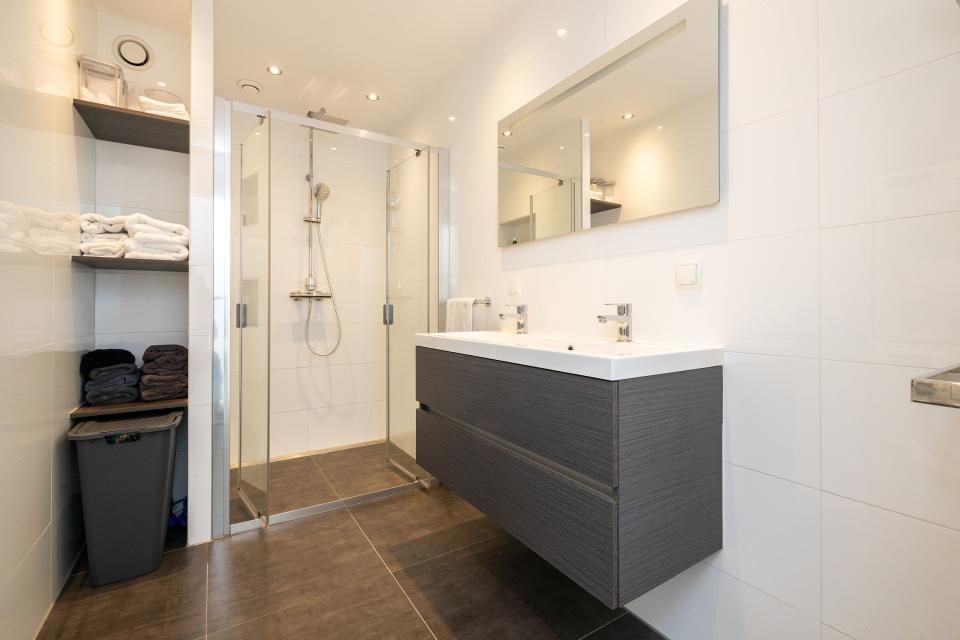 De moderne badkamer is tevens uitgevoerd in een grijs-witte kleurstelling en is voorzien van een ruime regendouche, een dubbele wastafel met badkamermeubel, aansluitingen voor de wasmachine en droger, en een ruimtebesparende nis voor het plaatsen van bijvoorbeeld badhanddoeken.