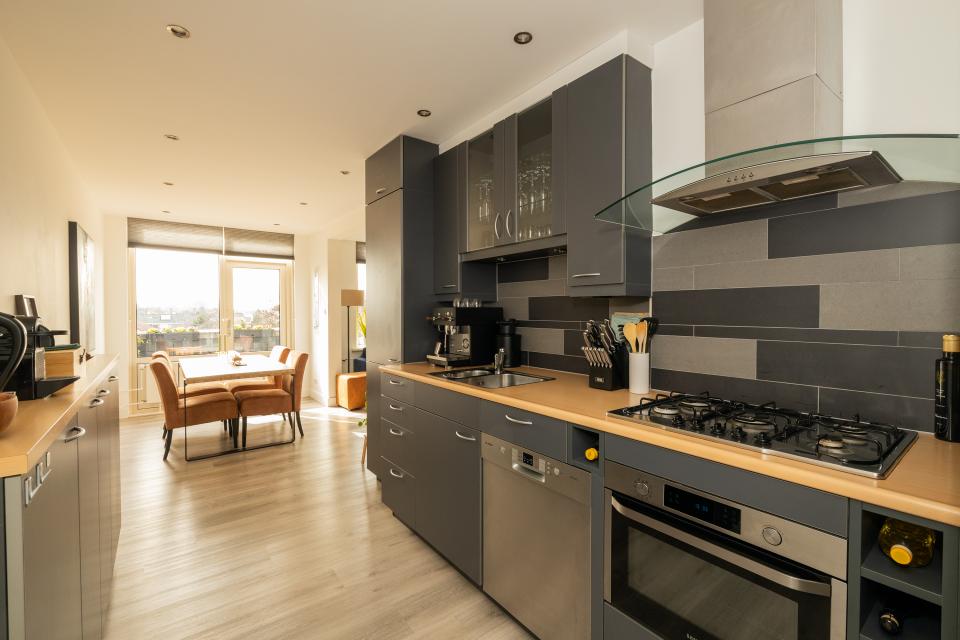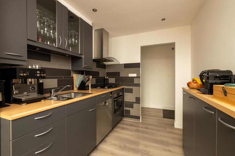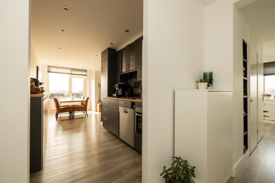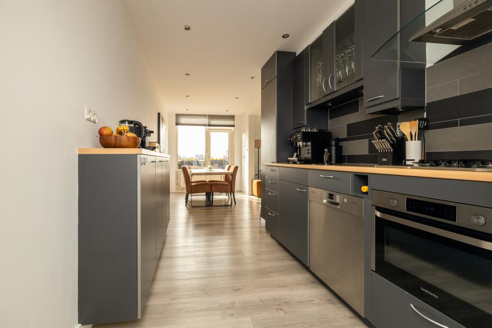 Vanuit de woonkamer is het balkon, gelegen op het zuidwesten, bereikbaar. De half open keuken, uitgevoerd in een praktische parallelopstelling, is voorzien van diverse inbouwapparatuur zoals 5-pitskookplaat, afzuigkap, combi-oven/magnetron, koel-vriescombinatie en vaatwasmachine.