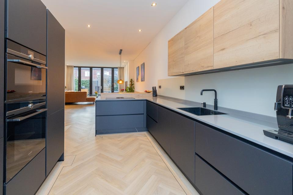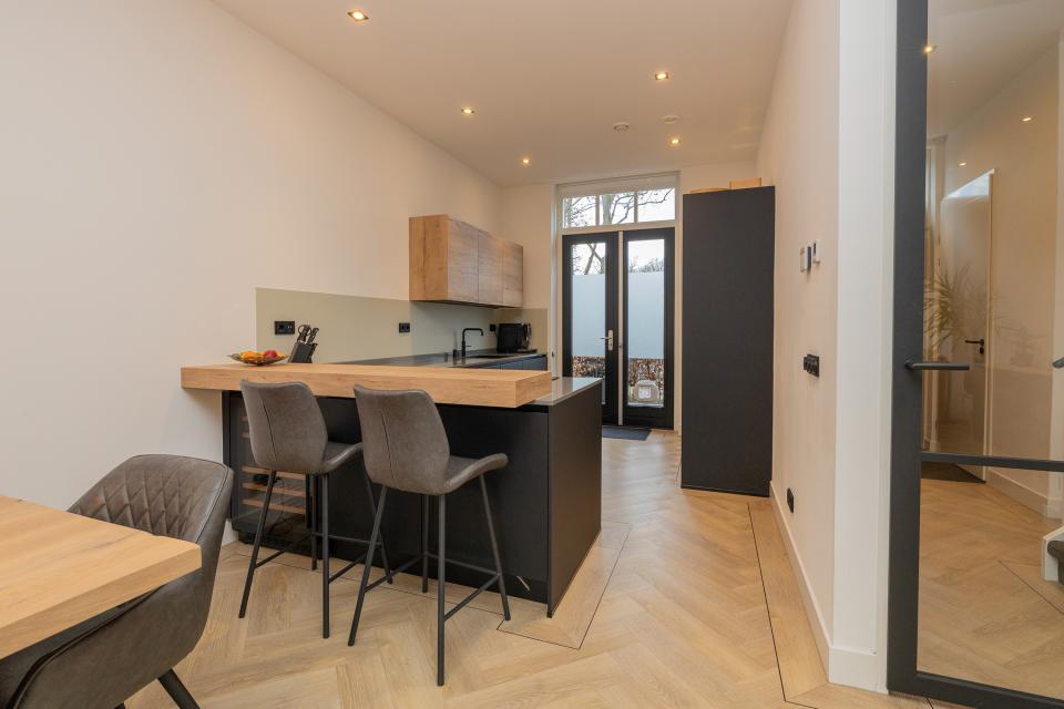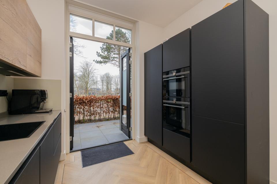 Aan de voorzijde bevindt zich de luxe open keuken in moderne kleurstelling, uitgevoerd in een praktische opstelling en voorzien van hoogwaardige inbouwapparatuur, waaronder een inductiekookplaat met geïntegreerd afzuigsysteem, oven, combi-magnetron, vaatwasser, koelkast, vriezer én een Quooker. Vanuit de keuken zijn openslaande deuren naar de zonnige voortuin waar u kunt genieten van het prachtige uitzicht op de Engelse tuin!