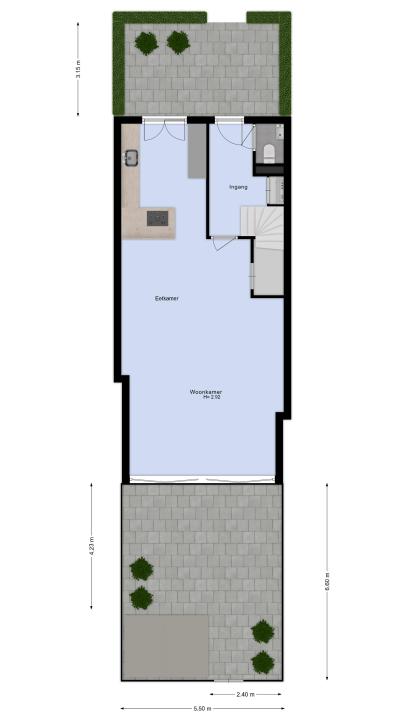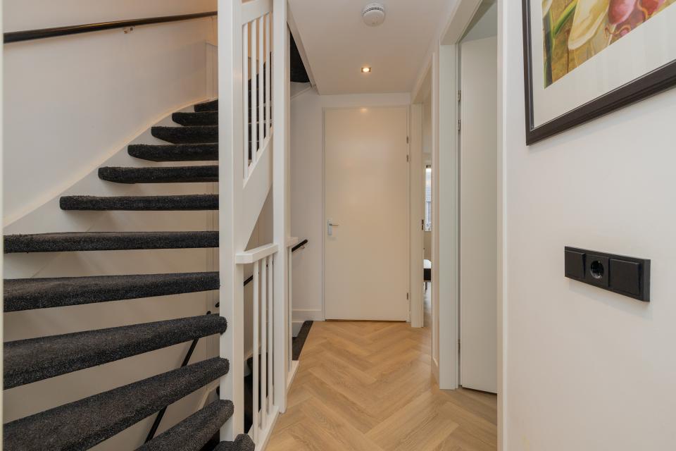 Begane grond:Via de voortuin bereikt u de entree van de woning. In de hal bevinden zich de meterkast , het vrij hangende toilet in moderne afwerking en vaste trap naar de verdieping. Vanuit de hal komt u in de lichte, aan de achterzijde uitgebouwde, zeer ruime woonkamer. De uitbouw is voorzien van grote raampartijen en volledig te openen harmonica deuren naar de achtertuin.