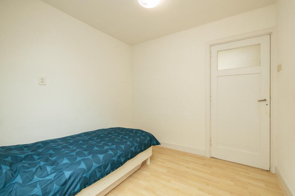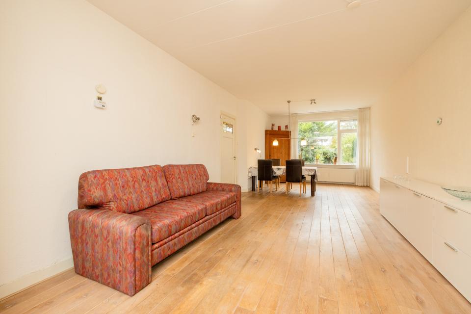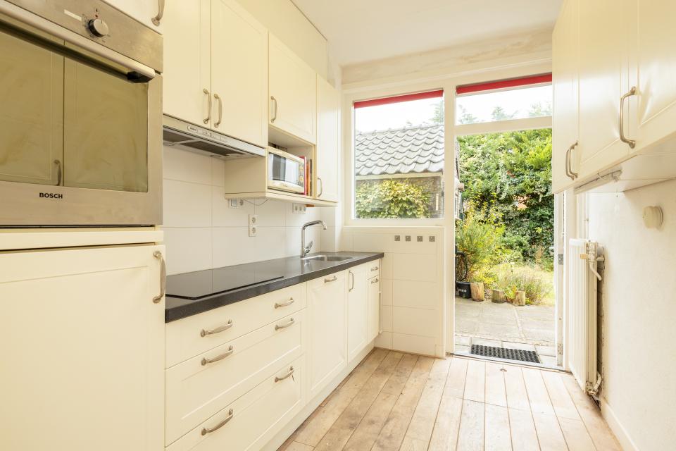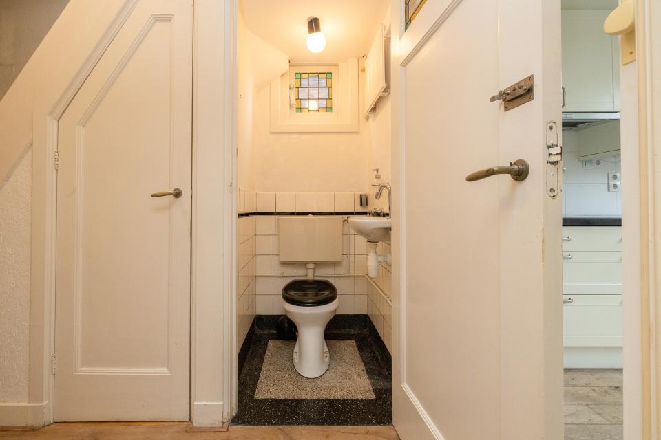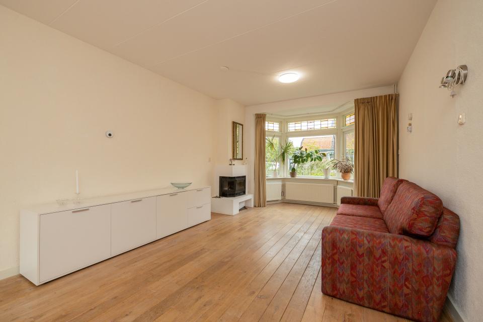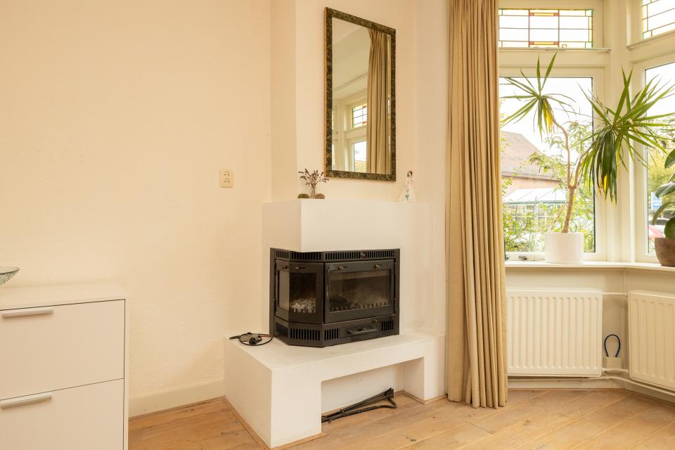 De originele voordeur met glas-in-lood ramen geeft toegang tot de hal met trapopgang en toilet. Vanuit hier stap je de woonkamer binnen, een heerlijke, lichte ruimte met houten vloer, houtkachel en een fraaie erker aan de voorzijde. Aan de achterzijde, bereikbaar vanuit de gang, bevindt zich de gesloten keuken. De keuken is praktisch ingedeeld en voorzien van inbouwapparatuur. Vanuit de keuken heb je direct toegang tot de zonnige achtertuin. Deze tuin is op het zuiden gelegen en is circa 10 meter diep.Eerste verdieping