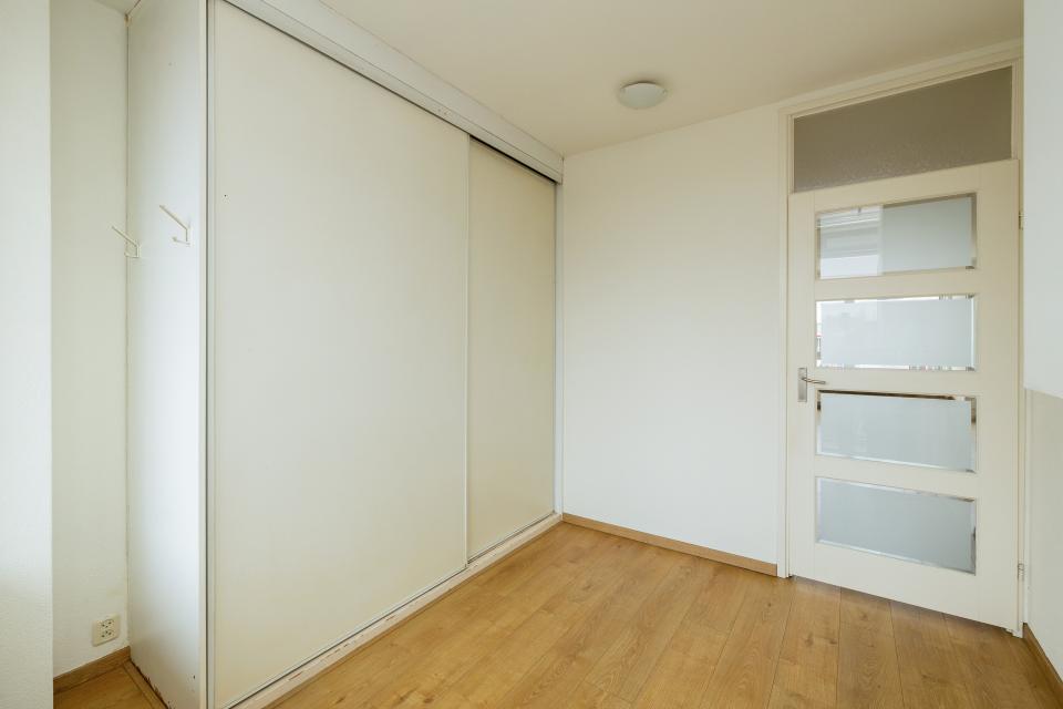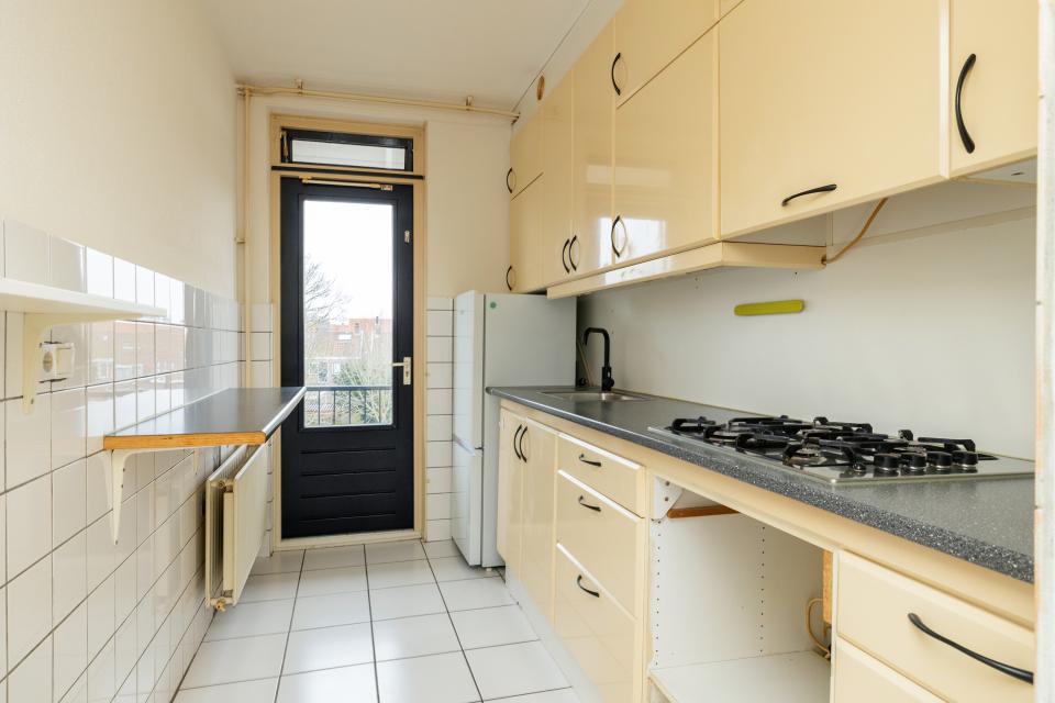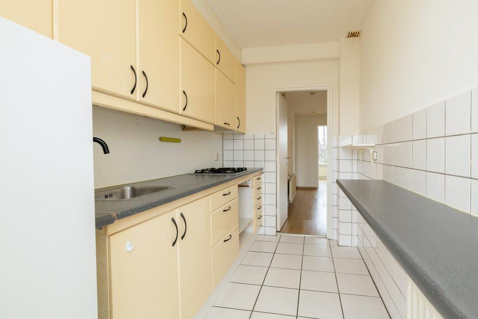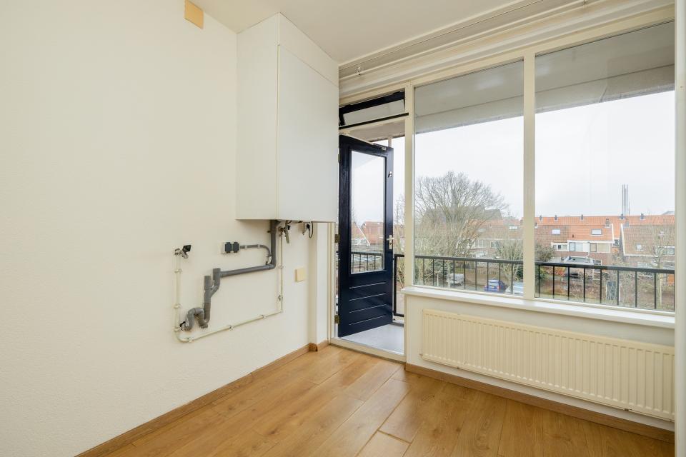 In het verlengde van de woonkamer bevindt zich een extra kamer, met toegang tot het balkon. Deze ruimte kan worden ingericht als bijvoorbeeld een werk/hobby kamer. Hier bevinden zich tevens de opstelplaats van de cv installatie en de aansluiting voor de wasmachine en wasdroger. De dichte keuken is praktisch ingericht en voorzien van boven,- en onderkasten. Ook vanuit de keuken is het balkon (ca. 8 m²) bereikbaar.