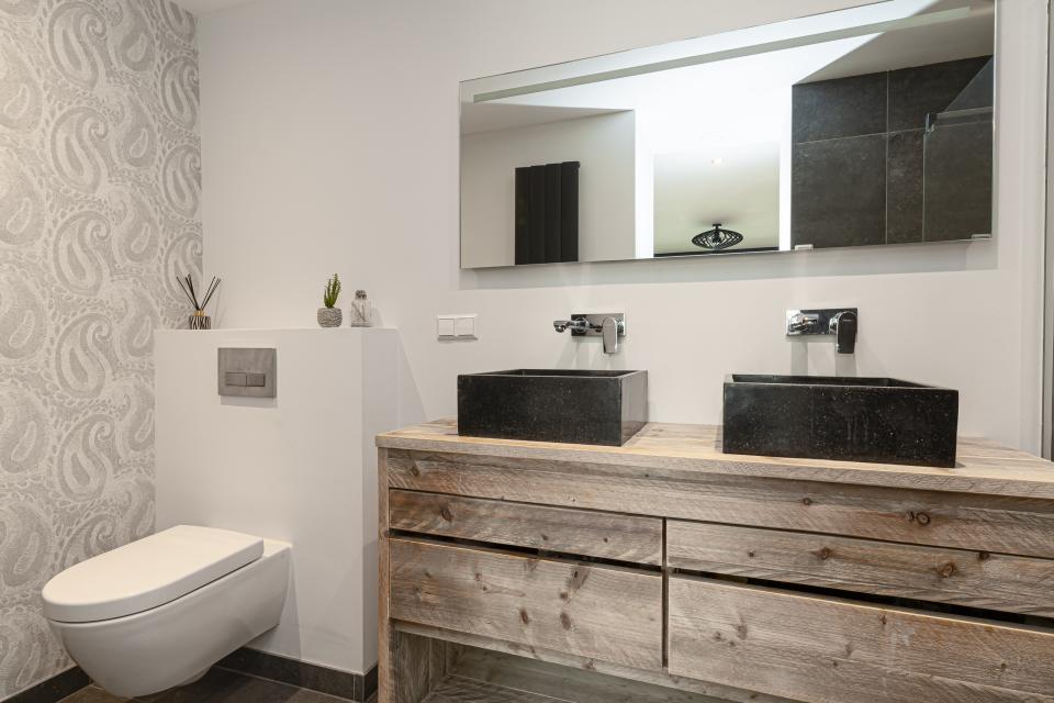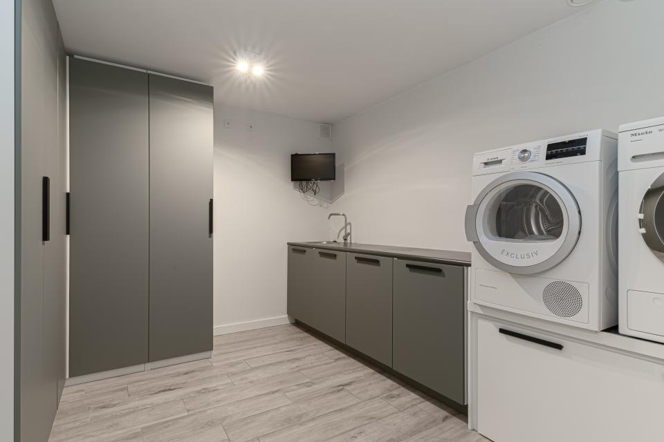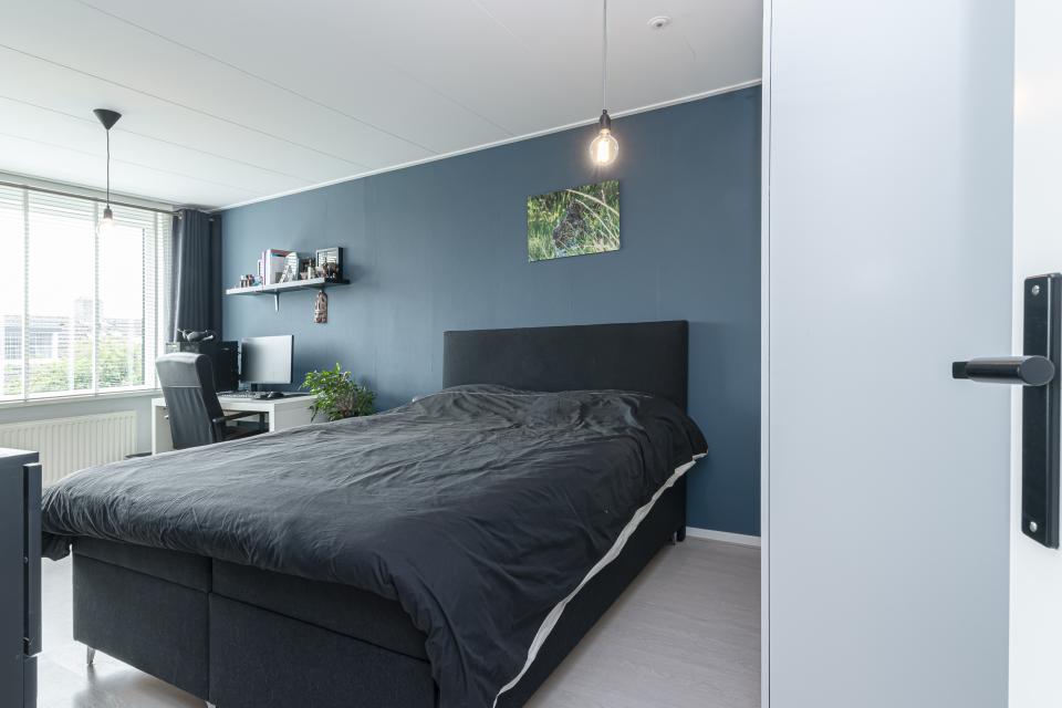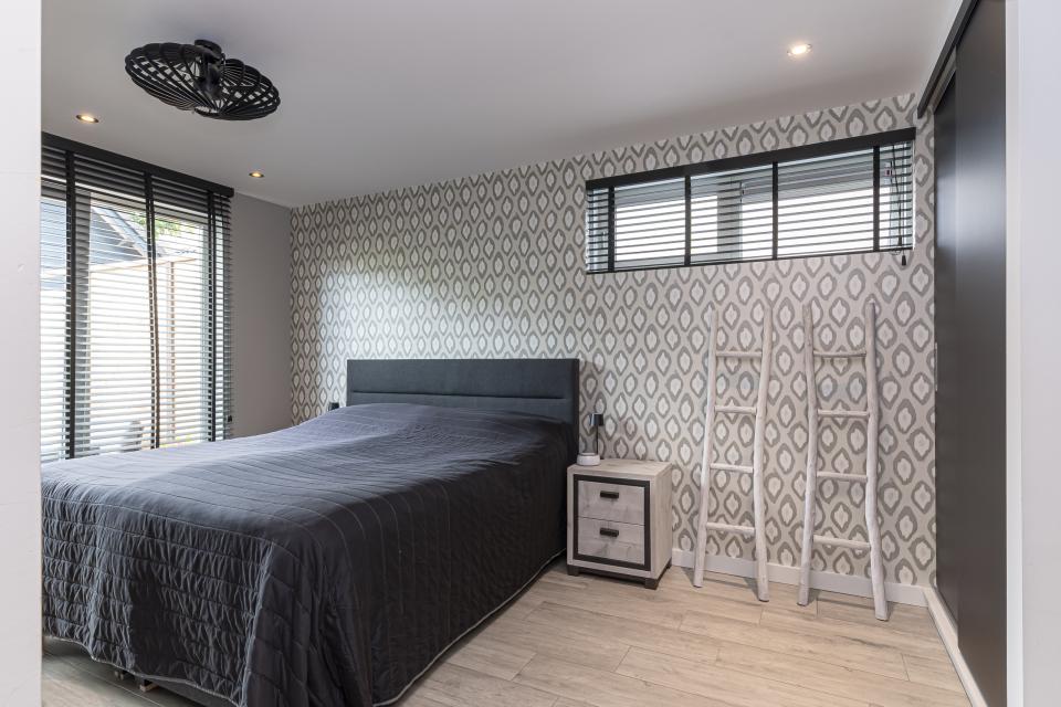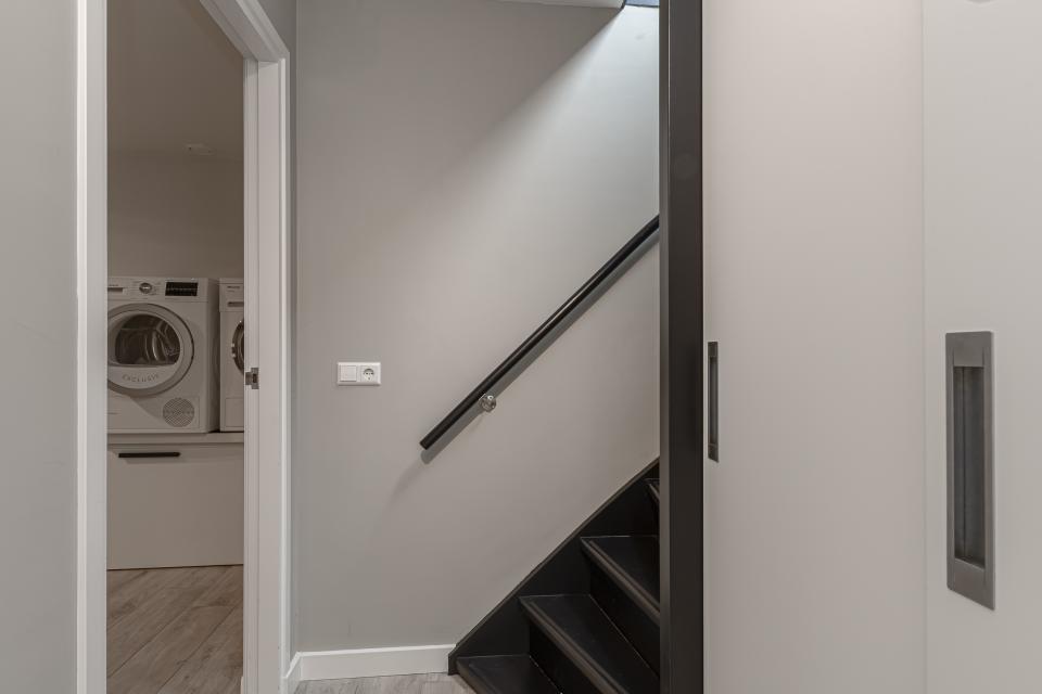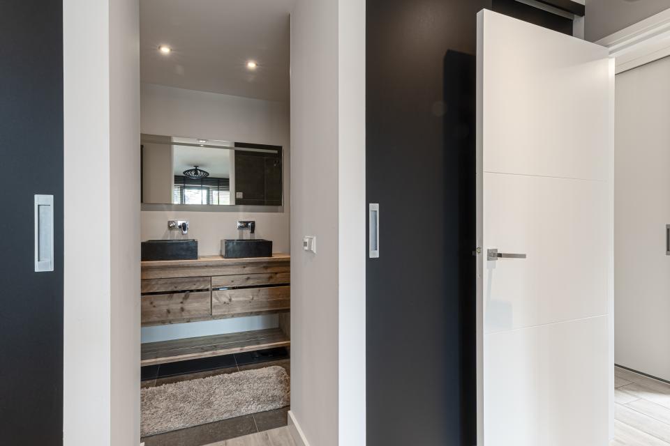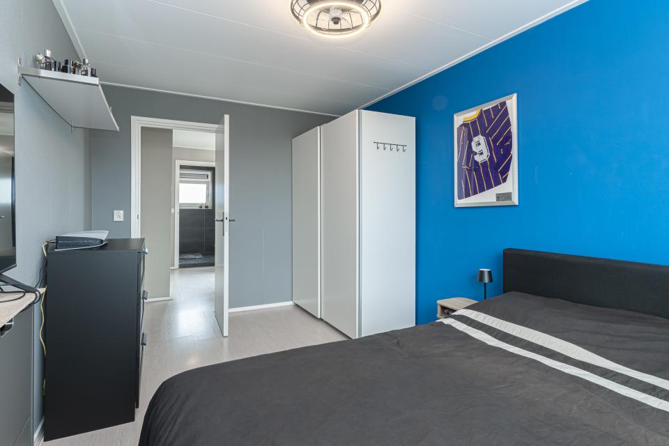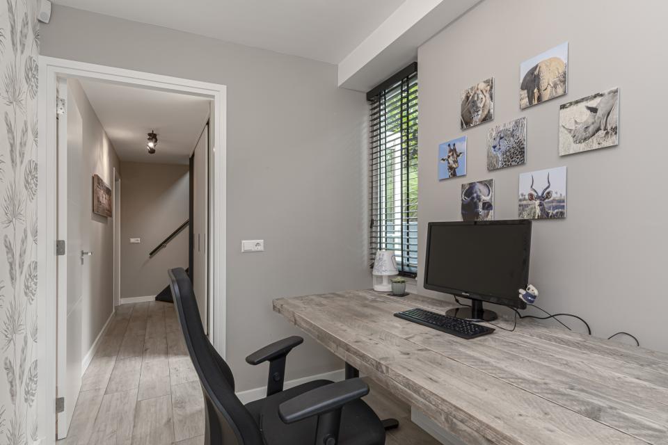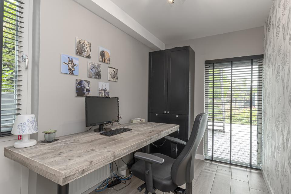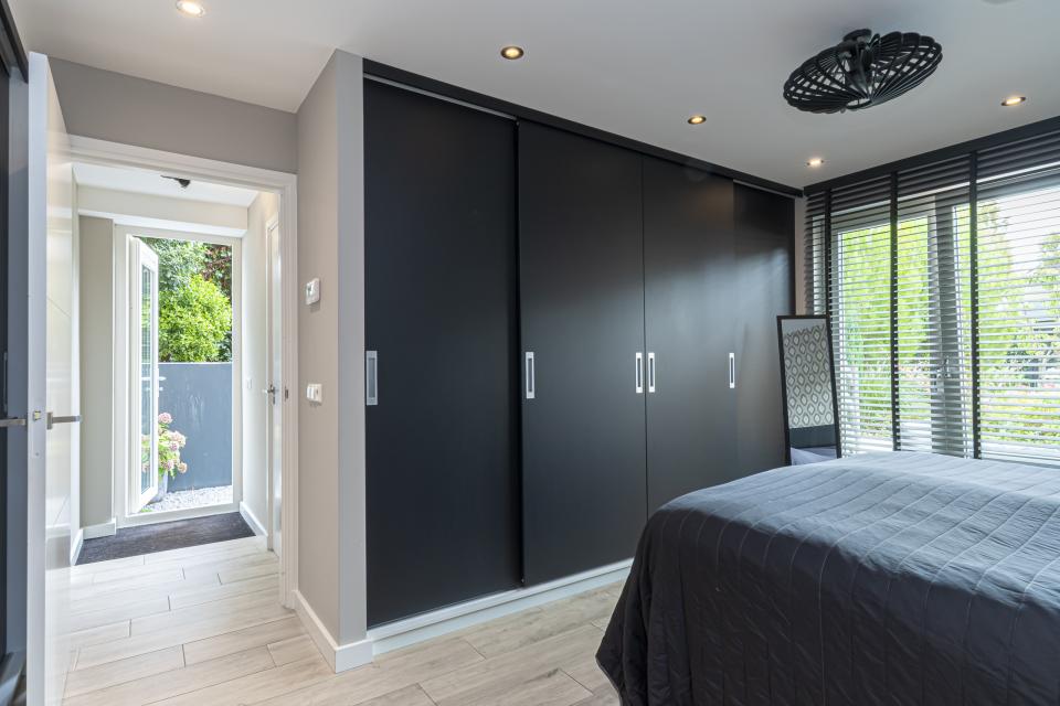 Hier is er een ruime slaapkamer met vasten kasten en een deur naar de tuin. Aansluitend aan deze slaapkamer is er een badkamer ensuite met inloopdouche, twee wastafels en een toilet. Naast deze slaapkamer bevindt zich nog een kleinere kamer, te gebruiken als werkkamer of slaapkamer/logeerkamer. Op deze verdieping is ook de ruime wasruimte met aansluitingen voor wasmachine/droger.Eerste verdieping