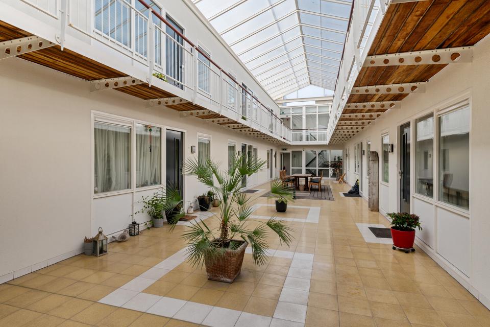 De entree van het appartement is via de passage die een verbinding vormt tussen de Kerkstraat en het Kloosterplein. Via de centrale entree kunt u de trap of de lift naar de 1e verdieping nemen. Aangekomen op de eerste verdieping is er sprake van een atrium waaraan de voordeur van het appartement gelegen is.
