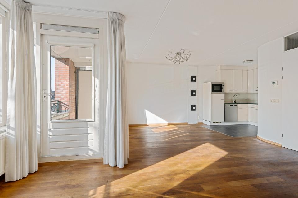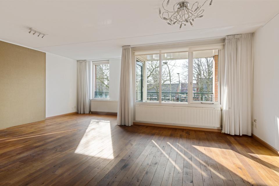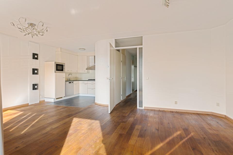 Tenslotte komt men vanuit de gang in de heerlijk lichte woonkamer met ramen over de gehele breedte van het appartement. Door de ligging ‘op de zuidkant’ en de daarmee gepaard gaande daglicht-inval voelt de woning eigenlijk altijd prettig en comfortabel aan.