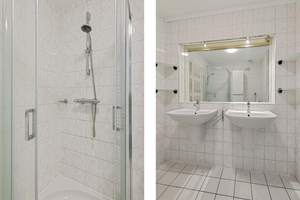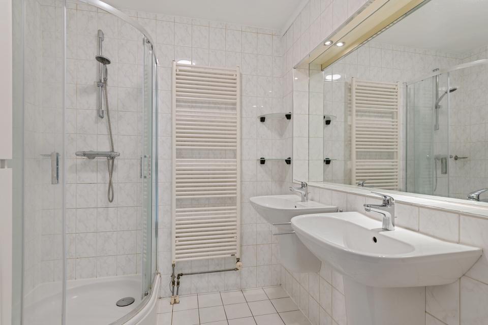 Dan is er de badkamer in lichte kleurstelling met een douche, dubbele wastafel en een handdoekenradiator. Tevens bevindt zich in de badkamer de opstelplaats voor de wasmachine. Naast de badkamer is een kleine inpandige berging waarin de c.v. combiketel is gemonteerd alsmede de box van de mechanische ventilatie en de groepenkast. Dan is er nog het toilet en een bergkast.