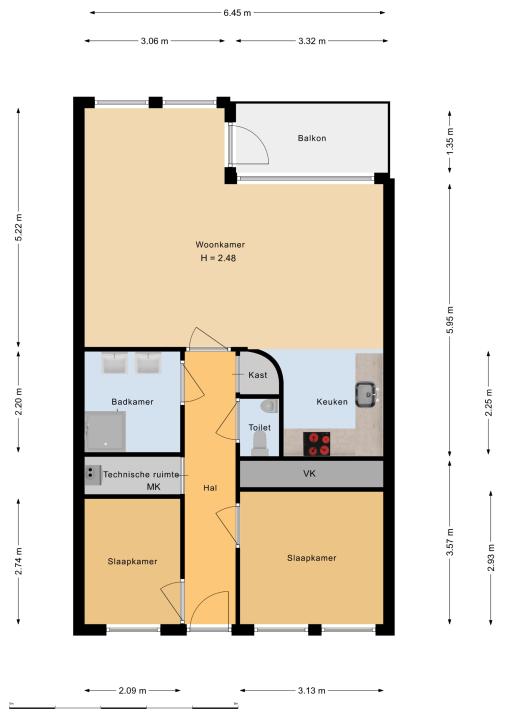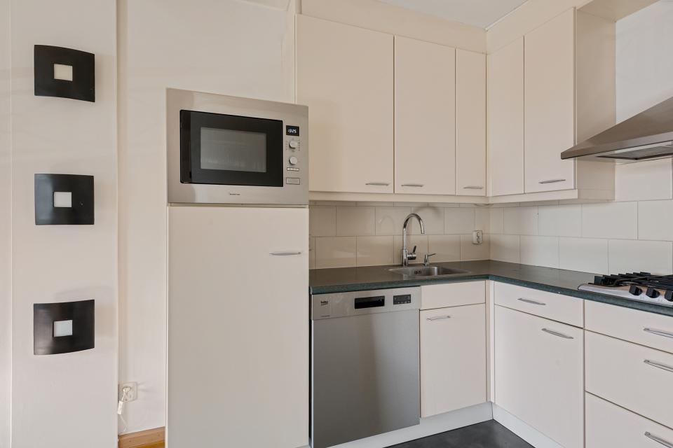 In het woongebied is ook de hoekkeuken geplaatst die is voorzien van de gebruikelijke inbouwapparatuur. (vaatwasser, koelkast, combi-magnetron, 5 pits gasfornuis met RVS afzuigkap) Vanuit de woonkamer is er nog toegang tot het heerlijk beschutte en vrij gelegen balkon. Door het uitzicht over het Kloosterplein naar de Bronckhorstschool en de Sint Jeroenskerk is er sprake van een levendig en aangenaam beeld.