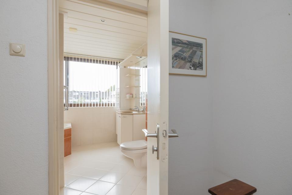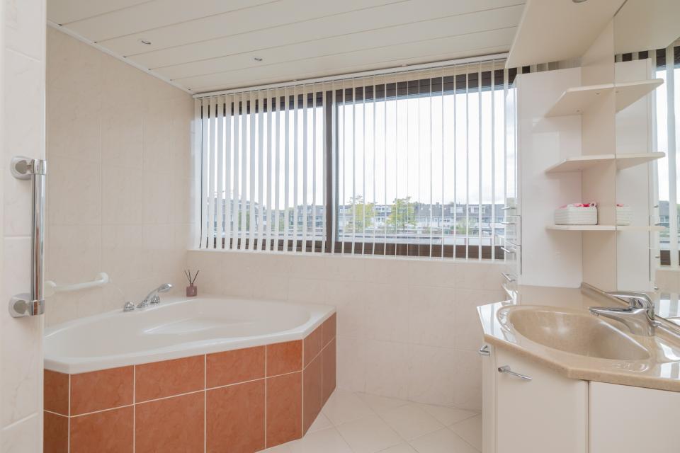 De overloop biedt toegang tot twee ruime slaapkamers, de badkamer en een aparte wasruimte. De nette badkamer beschikt over een ligbad, aparte douchecabine, wastafelmeubel en een tweede toilet. In het separate washok is plaats voor een wasmachine en droger.Tweede verdieping