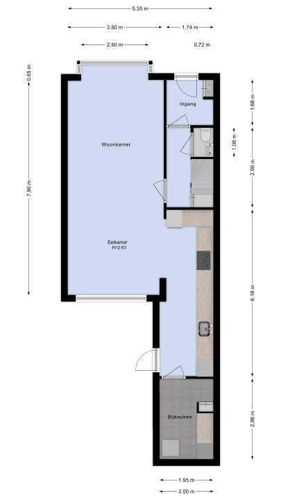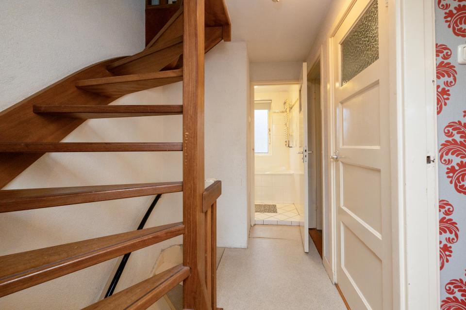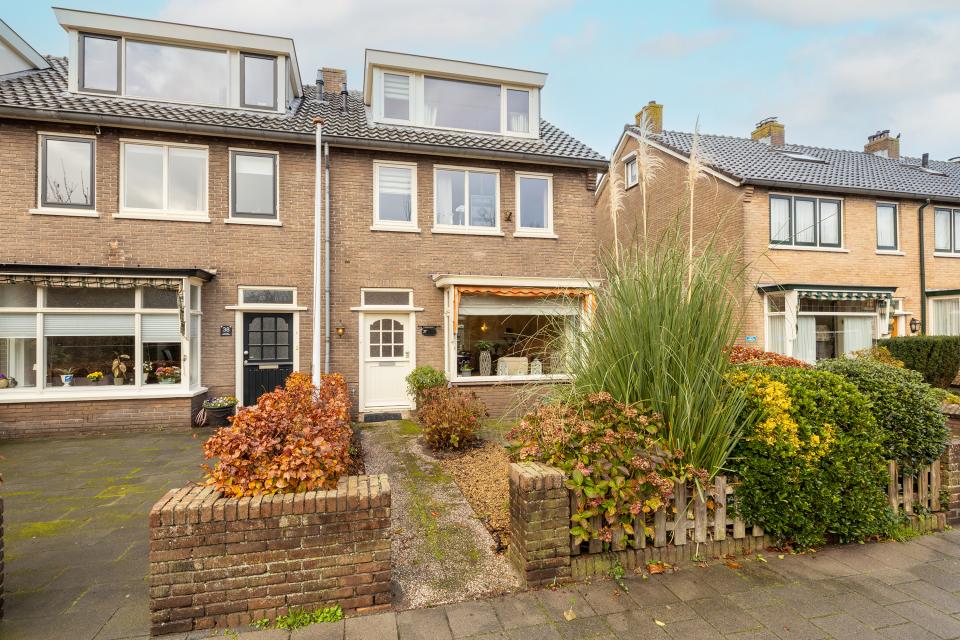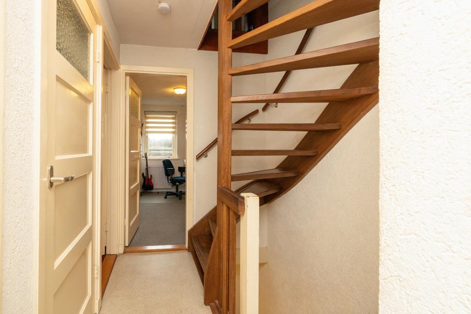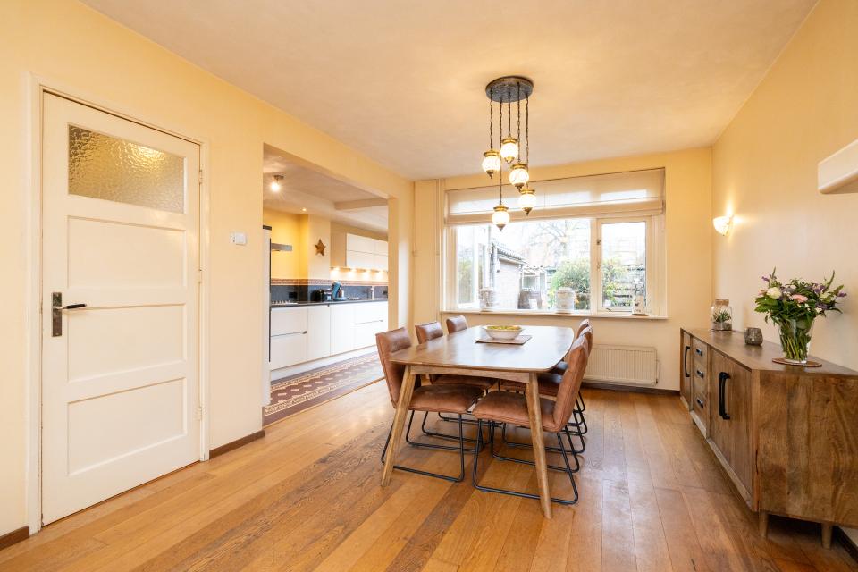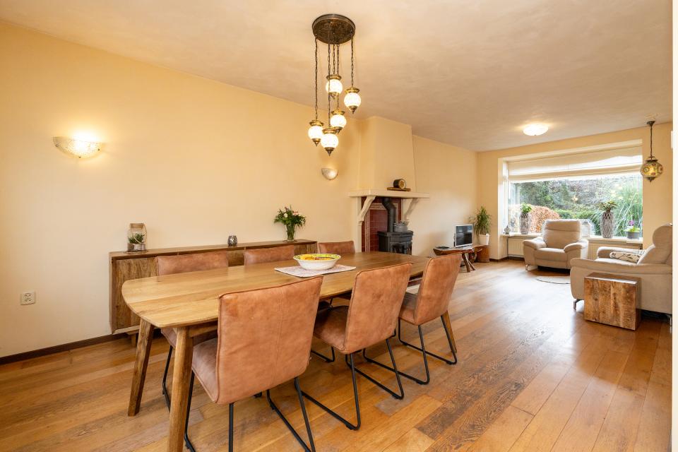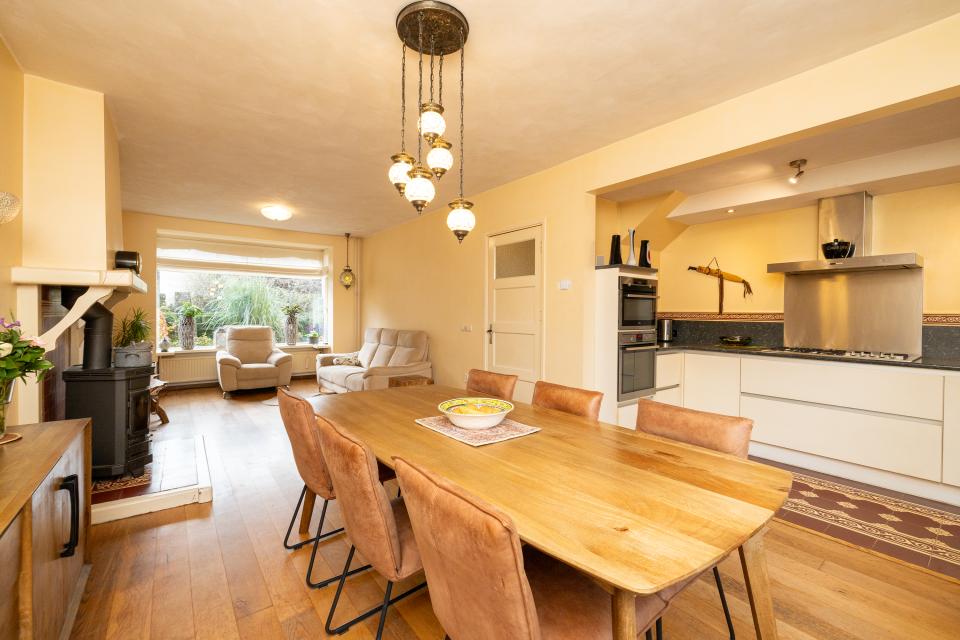 Al bij aankomst valt de brede voortuin op, die zorgt voor een uitnodigende entree. De erker aan de voorzijde, voorzien van een markies, geeft het huis een charmante uitstraling.Via de voordeur betreed je de hal, waar zich de meterkast, toiletruimte en de trapopgang naar de eerste verdieping bevinden. Vanuit de hal stap je de ruime woonkamer binnen, een doorzonkamer met grote raampartijen die zorgen voor veel daglicht. Aan de voorkant bevindt zich dus de karakteristieke erker. Centraal in de woonkamer bevindt zich een open haard. Aan de achterzijde is de eethoek geplaatst, met zicht op de tuin.