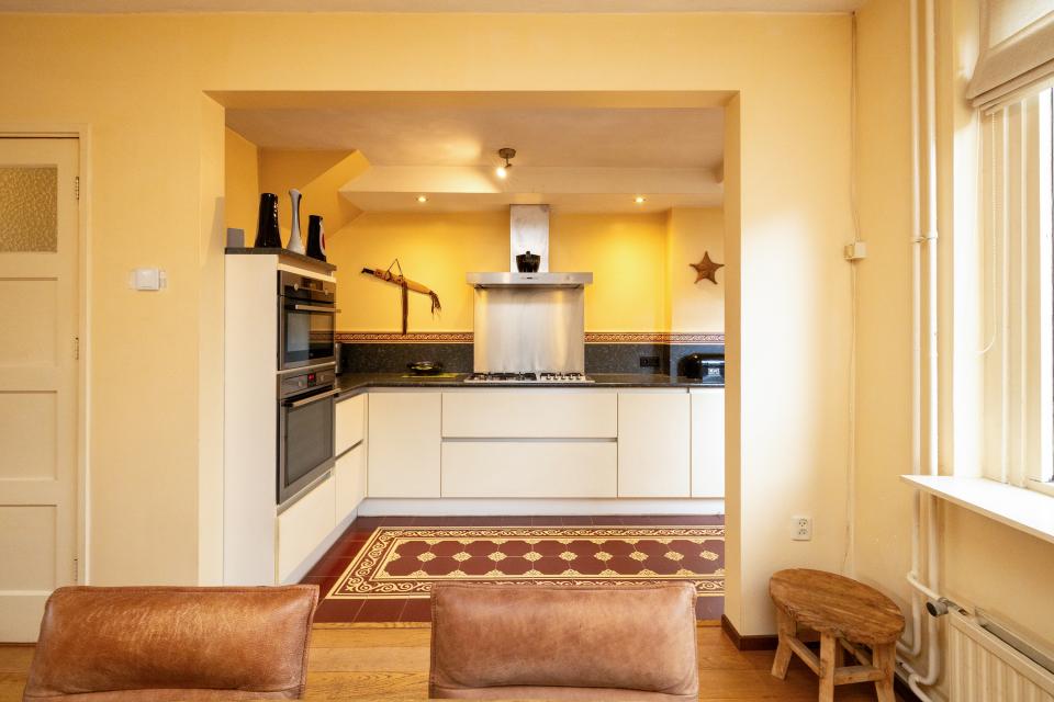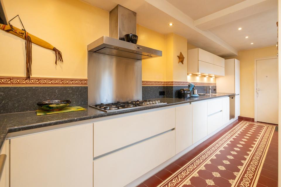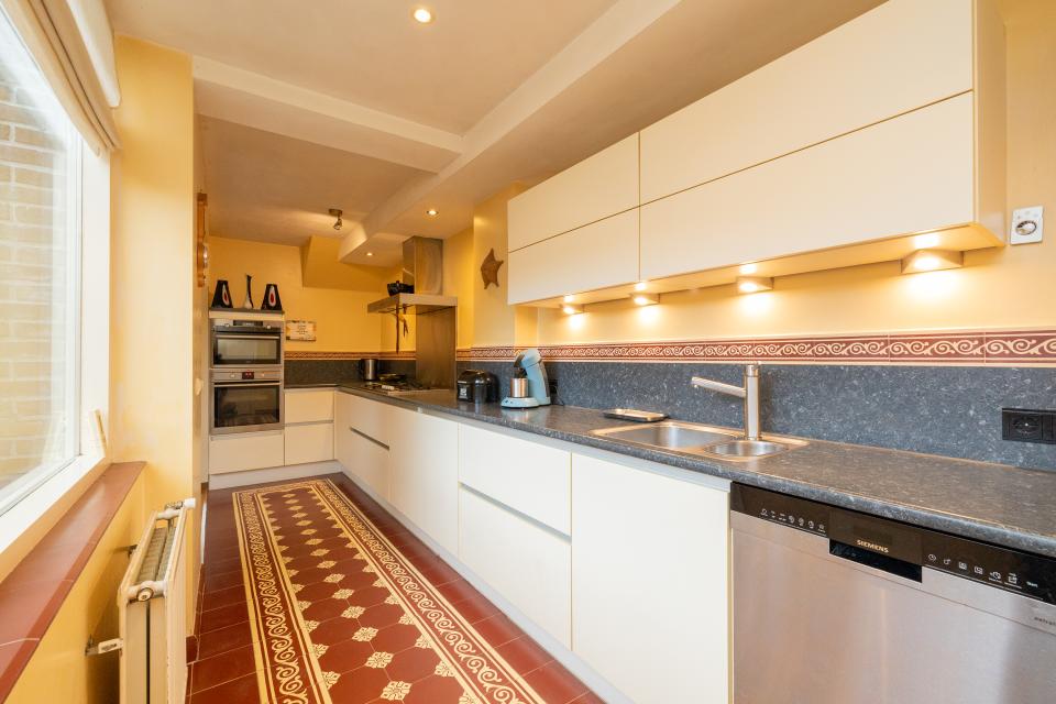 Aansluitend bevindt zich de aangebouwde open keuken, praktisch ingericht en voorzien van diverse inbouwapparatuur waaronder: een 5-pits gasfornuis, oven, magnetron, afzuigkap en vaatwasser. Aansluitend is er de bijkeuken. Hier is ook aansluiting wasmachine.