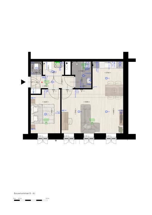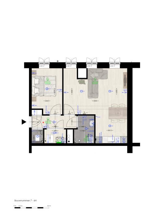 Op de tekeningen en impressiebeelden zijn keukens ingetekend ter illustratie. De woningen worden echter zonder keuken opgeleverd. Op de tekening aangegeven keuken aansluitingen zullen wel aanwezig zijn. De sanitaire ruimtes in de woningen worden voorzien van sanitair en tegelwerk en zijn bij de koopsom inbegrepen. .Vereniging van Eigenaren
