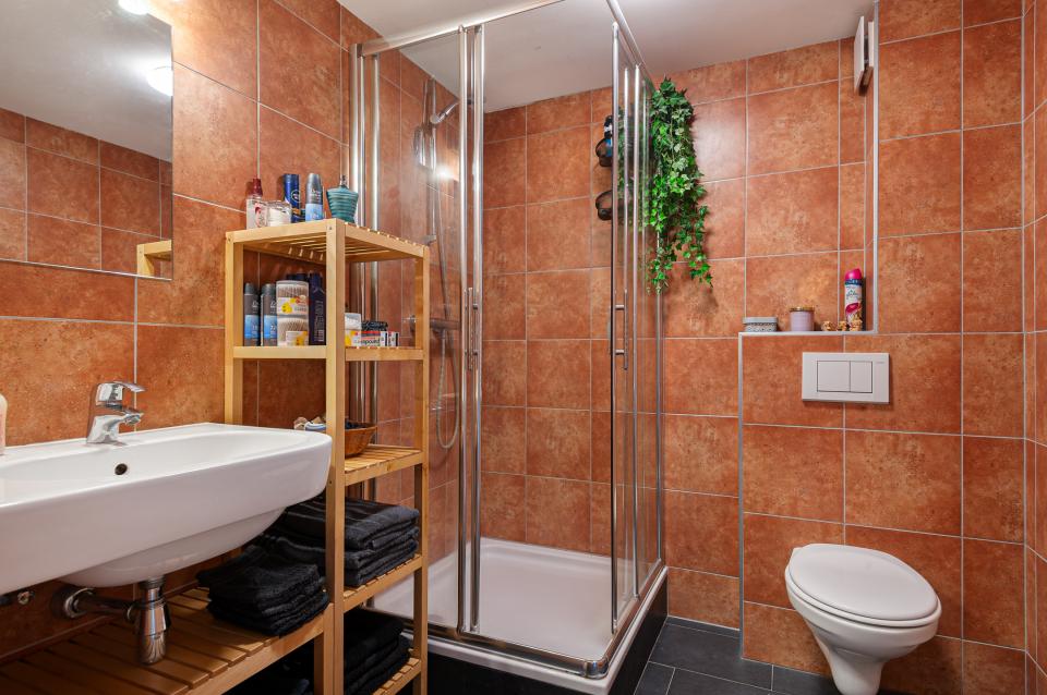 Aan de achterzijde ligt de tweede slaapkamer. De centraal gelegen badkamer is voorzien van een douche, toilet en wastafel.