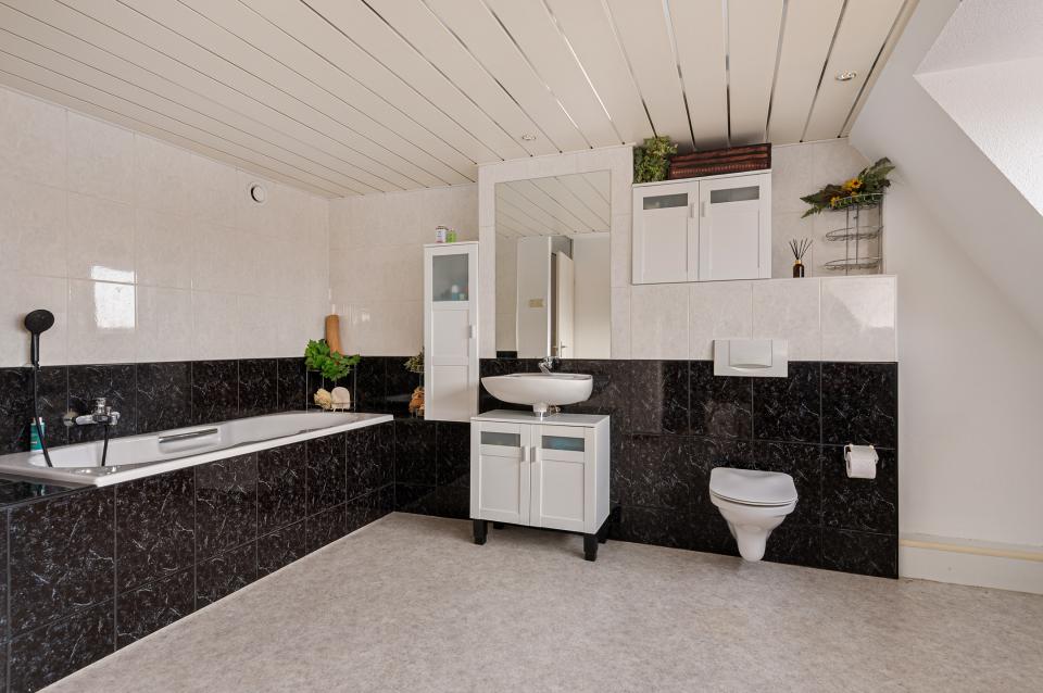 Daarnaast bevindt zich op deze verdieping een tweede, zeer ruime badkamer met dakkapel, voorzien van een ligbad, wastafel en toilet.
