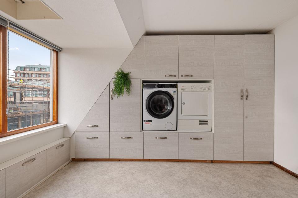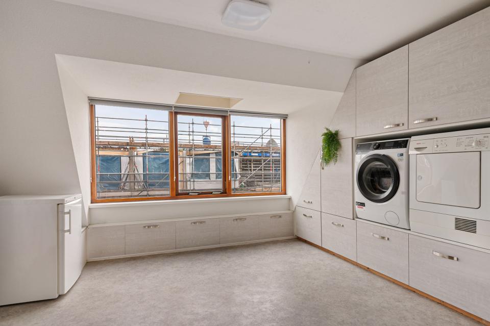 Ruime zolderverdieping met overloop en een derde werk-/slaapkamer met dakkapel. De praktische kastenwand biedt veel bergruimte en aansluitingen voor de wasmachine en droger.