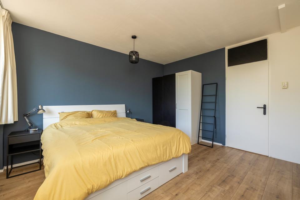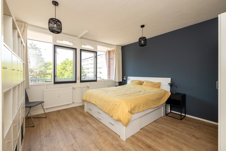Aangrenzend aan de woonkamer vindt u een tweede hal die toegang biedt tot de overige ruimtes. Aan de balkonzijde is er de royale hoofdslaapkamer welke ook voorzien is van flinke raampartijen dus heerlijk licht.