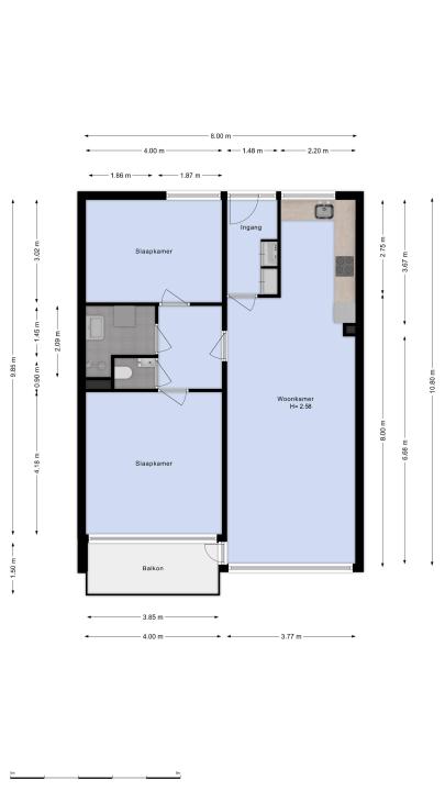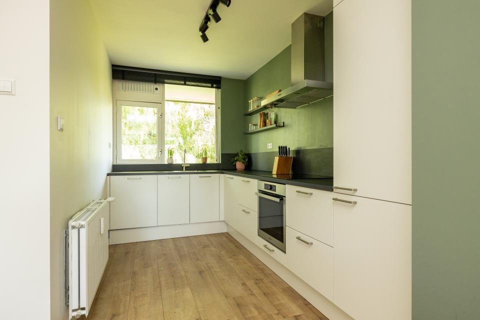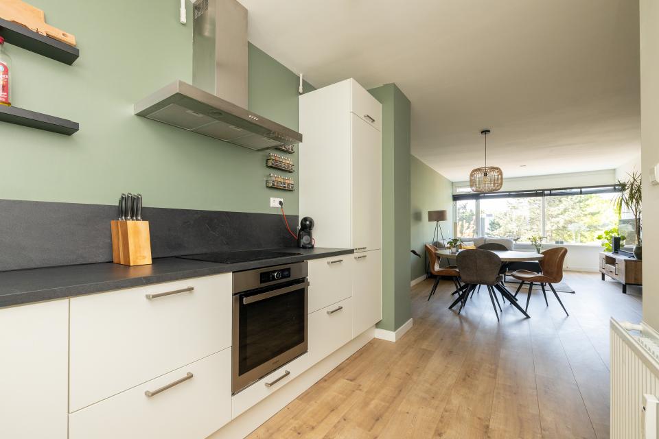 Aan de galerijzijde bevindt zich de lichte, moderne keuken in L-opstelling. De keuken is voorzien van inbouwapparatuur t.w. een koel-vriescombinatie, inductie kookplaat met afzuigkap en een combi-oven en vaatwasser.