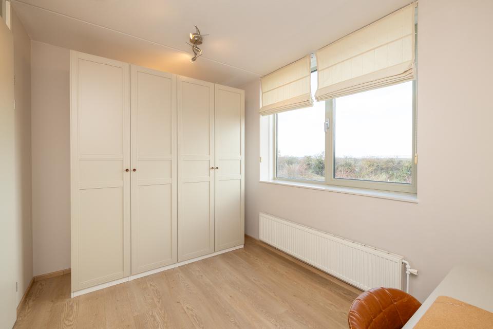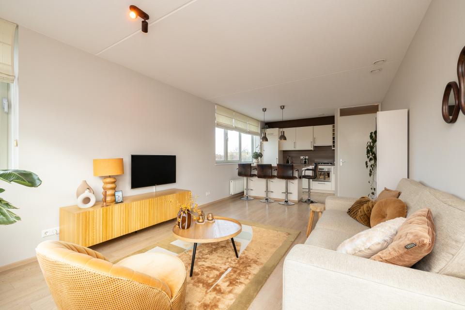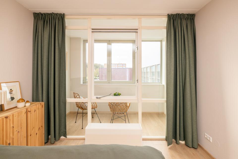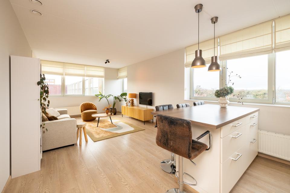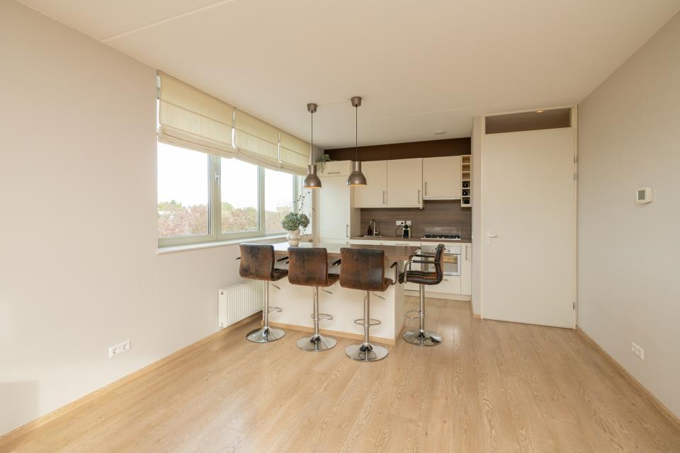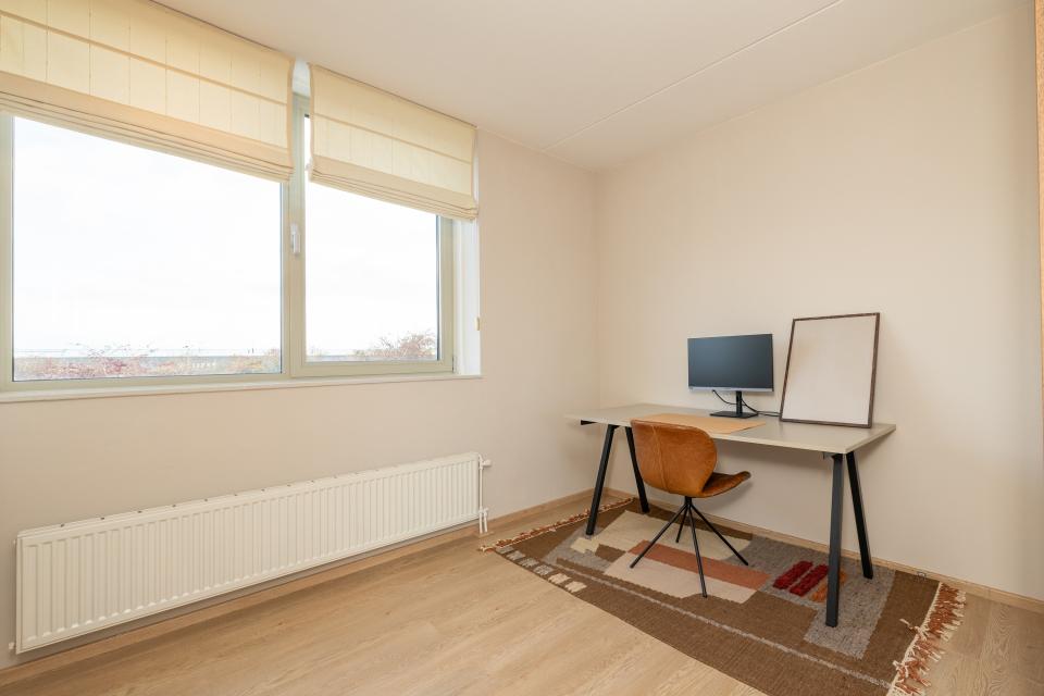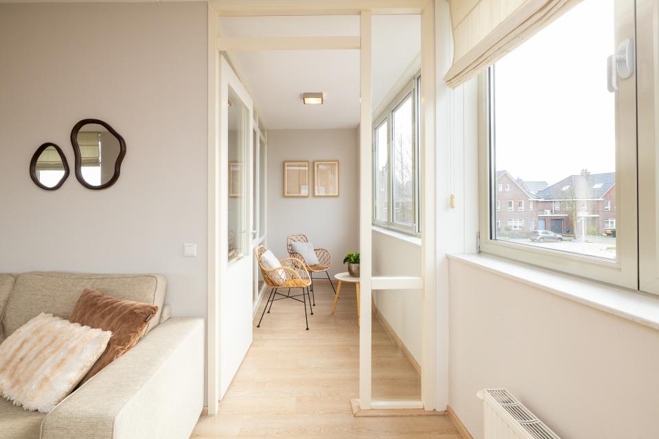 De lichte woonkamer is voorzien van grote raampartijen die zorgen voor een prettige lichtinval. De aangrenzende inpandige loggia is een veelzijdige ruimte die ideaal te gebruiken is als werkplek, hobbyruimte of heerlijk beschut zitje.