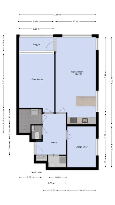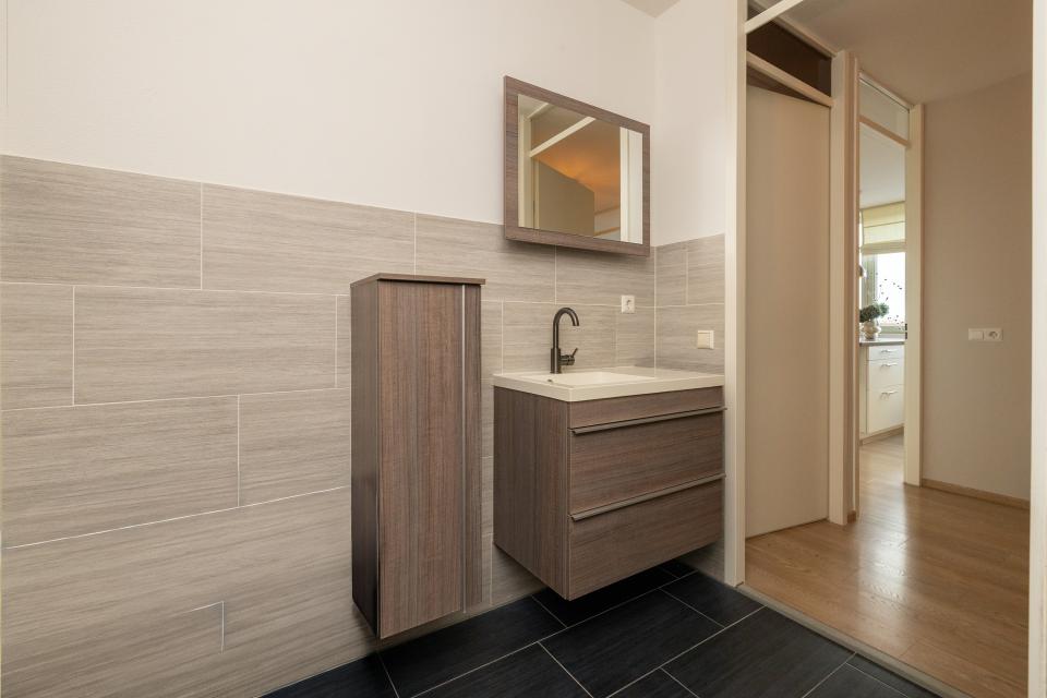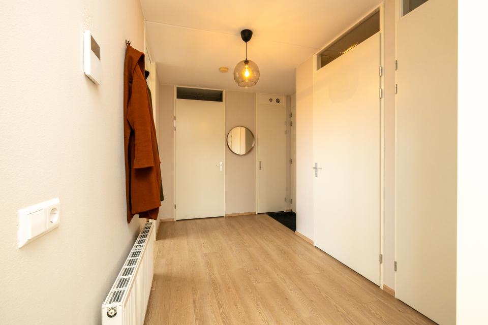 Binnenkomst in de ruime hal met toegang tot alle vertrekken. In de hal bevinden zich de meterkast, het separate toilet met fonteintje en een praktische inpandige berg-/technische ruimte met aansluitingen voor wasmachine en droger, de mechanische ventilatie-unit en de CV-ketel.De lichte woonkamer is voorzien van grote raampartijen die zorgen voor een prettige lichtinval. De aangrenzende inpandige loggia is een veelzijdige ruimte die ideaal te gebruiken is als werkplek, hobbyruimte of heerlijk beschut zitje.