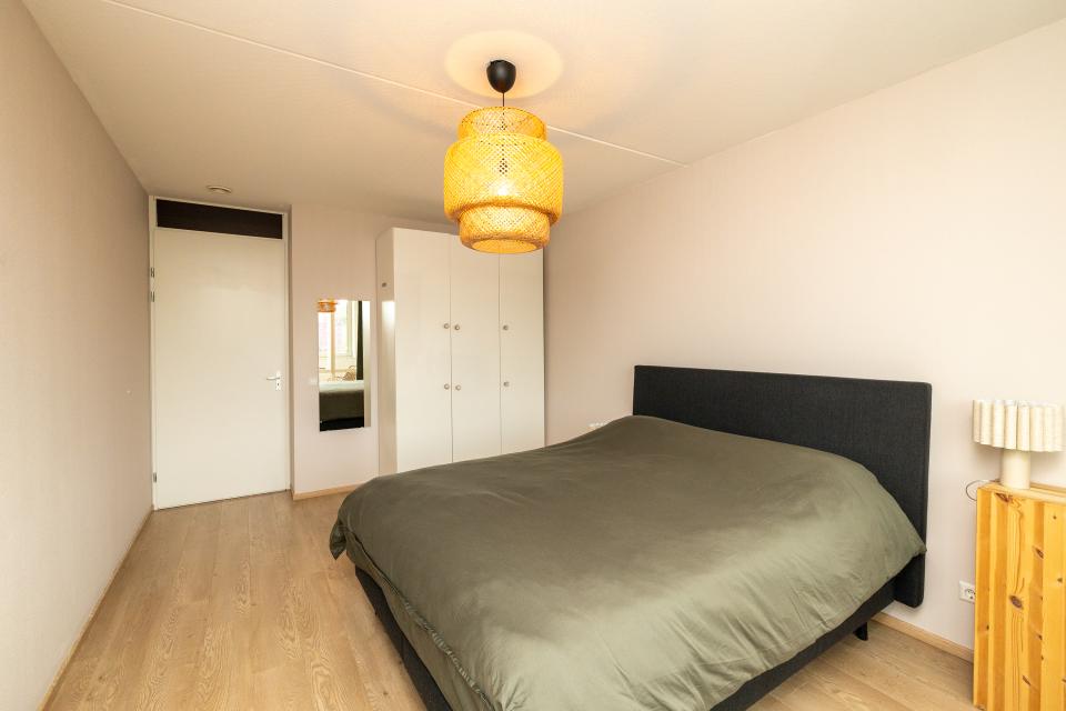 Het appartement beschikt over twee slaapkamers, waaronder een royale hoofdslaapkamer en een tweede volwaardige kamer. De badkamer is uitgevoerd in een frisse kleurstelling en voorzien van een inloopdouche en een modern wastafelmeubel.