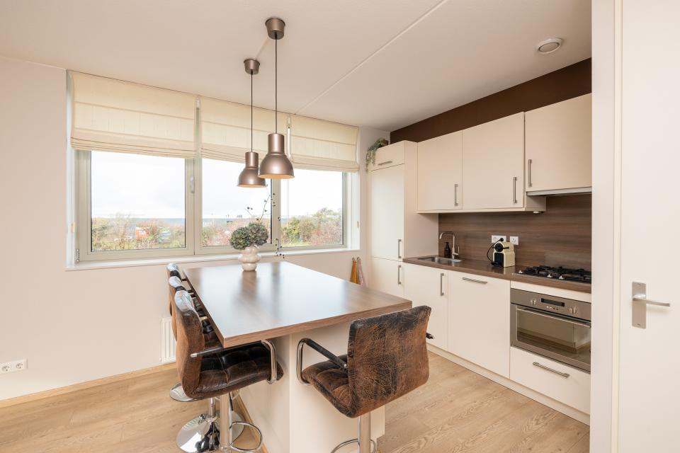 De open keuken is uitgevoerd in een lichte kleurstelling en beschikt over diverse inbouwapparatuur, waaronder een koel-/vriescombinatie, vaatwasser, combi oven/magnetron, 4-pits gaskookplaat en afzuigkap.