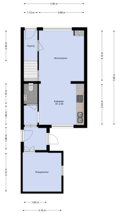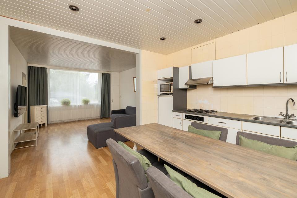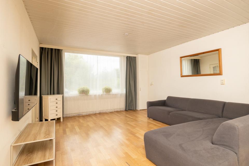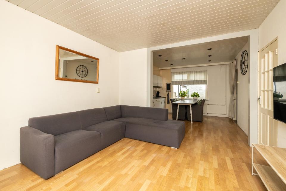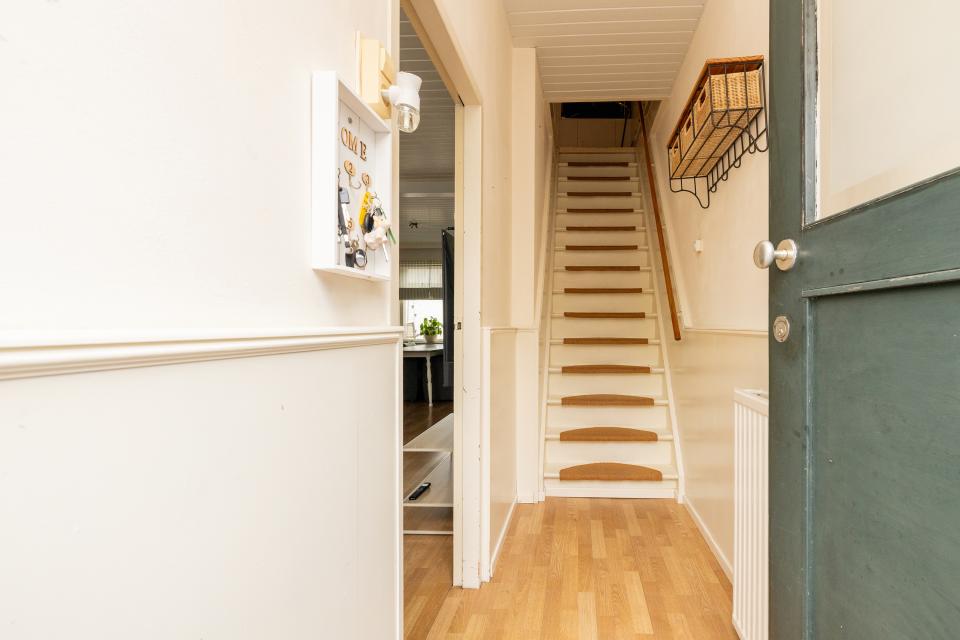 De woning beschikt over een gezellige woonkamer met grote raampartijen die zorgen voor veel natuurlijk licht en open keuken opstelling. De lichte laminaatvloer geeft de woning een frisse uitstraling. Via de hal met trapopgang bereik je zowel de woonkamer als de verdieping.Begane grond