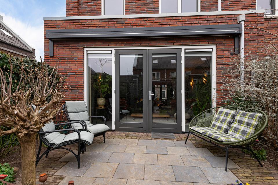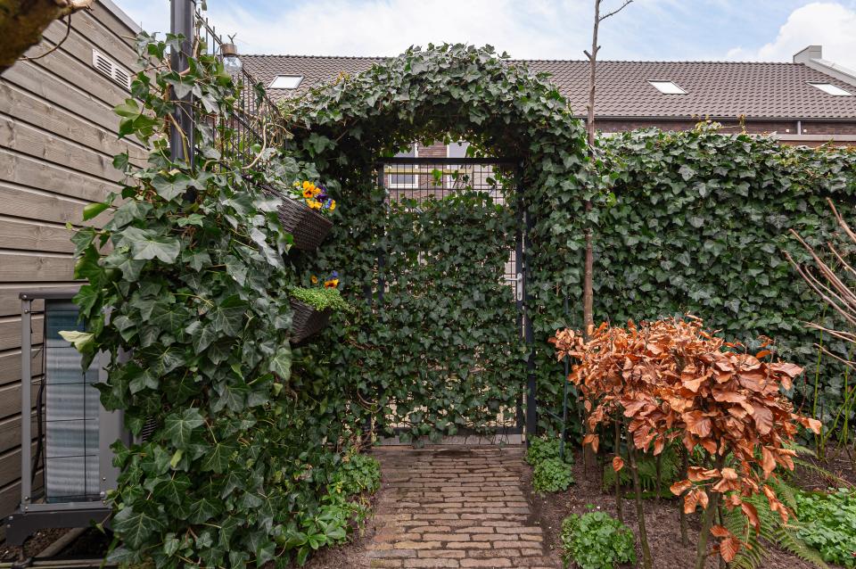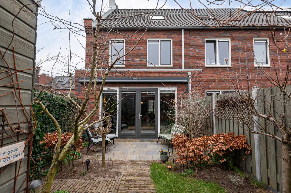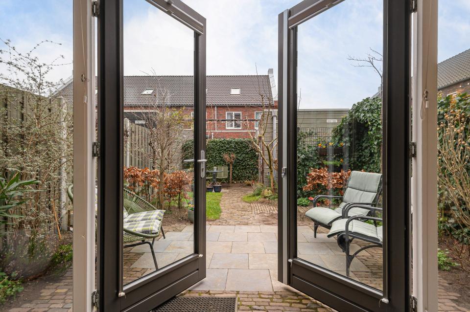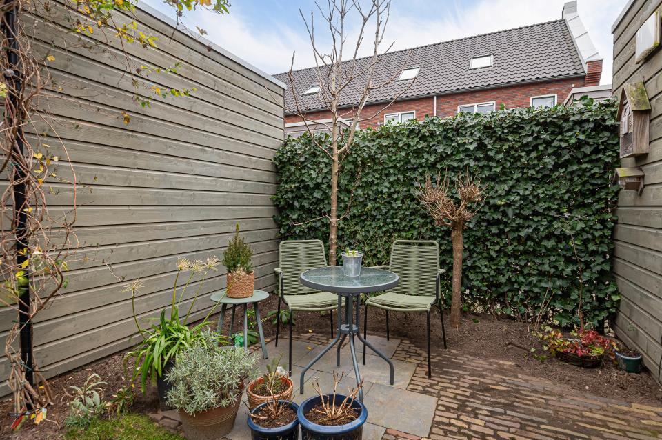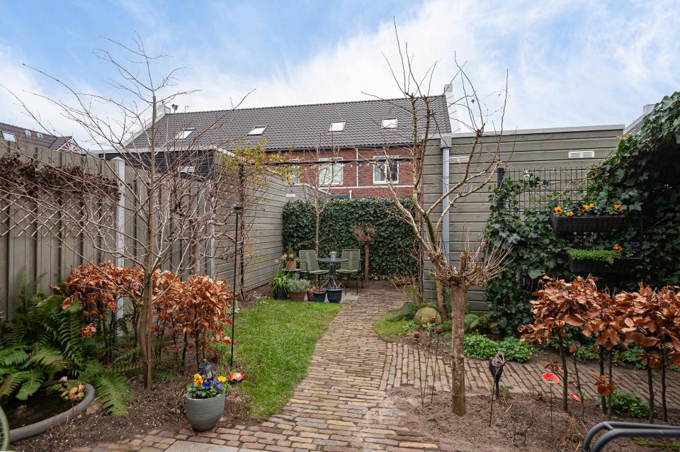De tuin beschikt over meerdere zitplekjes, ideaal voor het juiste moment van de dag. De bestrating is uitgevoerd in oude waaltjes en Belgisch hardsteen, wat de tuin een tijdloze en unieke uitstraling geeft. Verder is er diverse beplanting aanwezig, waaronder een appelboom en een lijsterbes, en zorgt een fonteinschaal voor extra sfeer en rust.