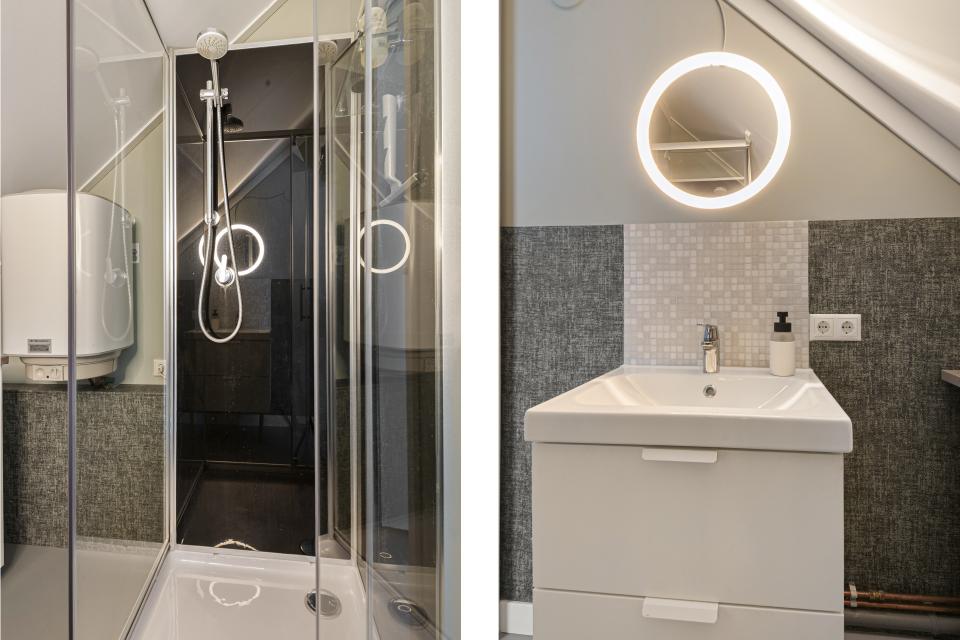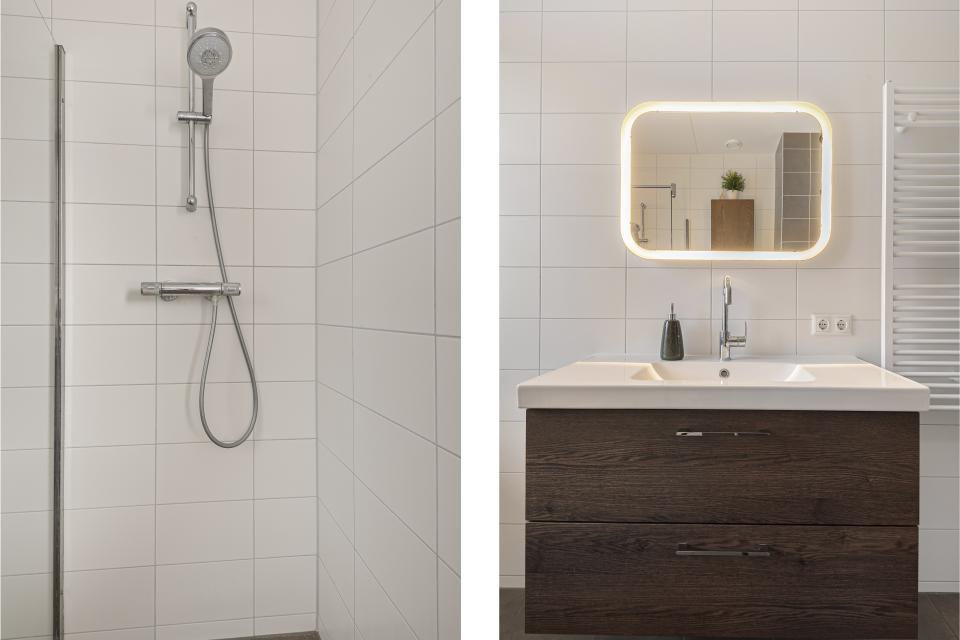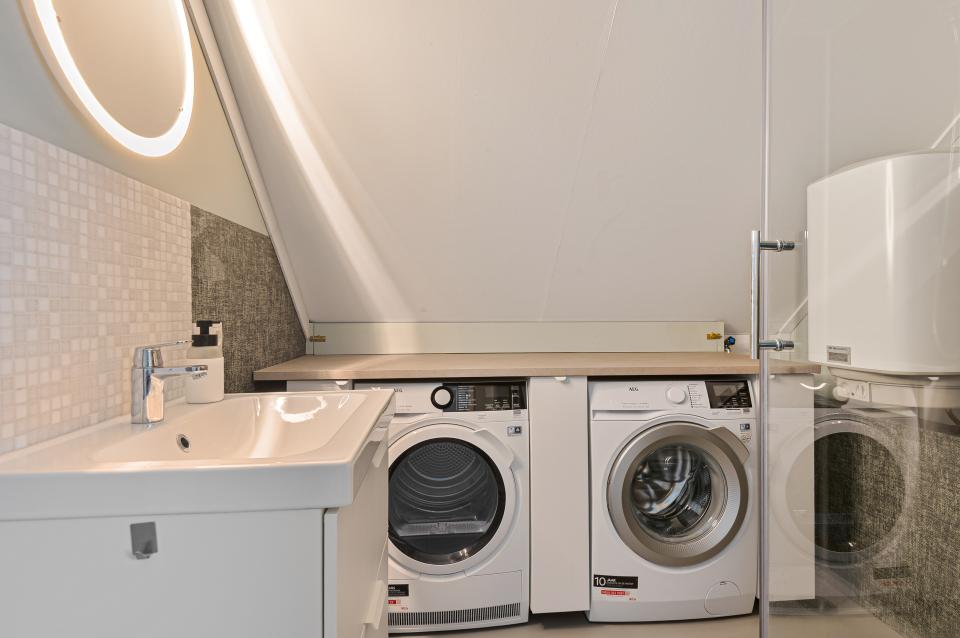 Daarnaast is er een tweede badkamer met douche, wastafelmeubel, verlichte spiegel en aansluitingen voor wasmachine en droger met handig werkblad. In deze ruimte bevindt zich ook een aparte 50 liter boiler voor warm water t.b.v. deze badkamer.