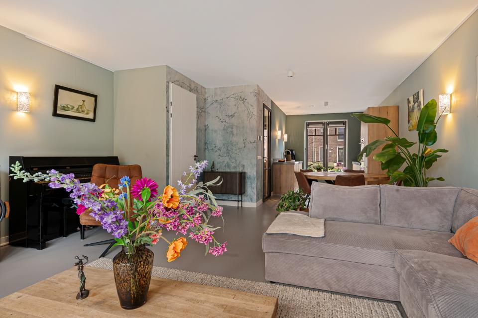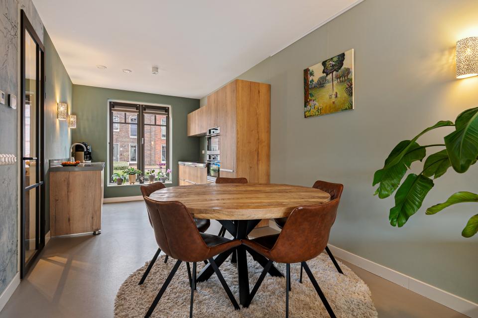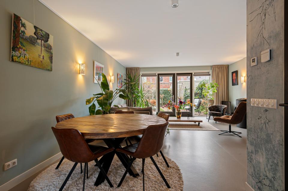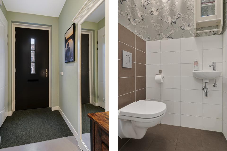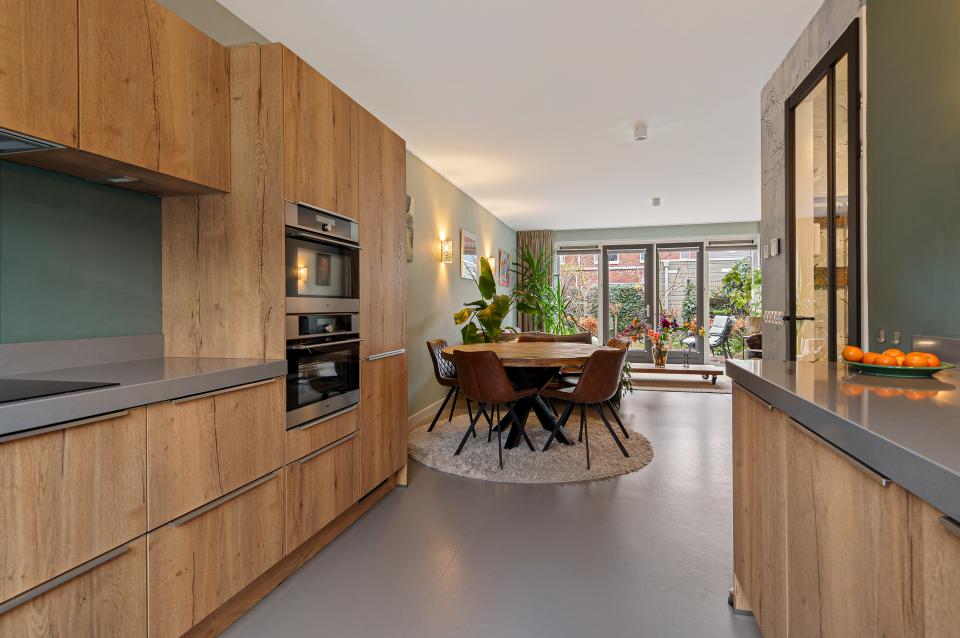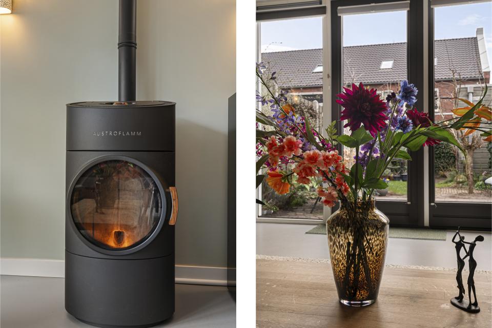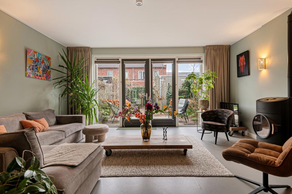 Bij binnenkomst ervaart u direct de warme sfeer van deze woning. De hal biedt toegang tot een toilet met hangend closet en fonteintje en de meterkast. De uitgebouwde (1,20 meter) woonkamer is voorzien van linoleum met vloerverwarming en openslaande deuren naar de op het oosten gelegen achtertuin. Voor extra warmte en gezelligheid is er een Austroflamm Pelletkachel aanwezig. De sfeervolle keuken aan de voorzijde is van alle gemakken voorzien: een composiet aanrechtblad, koelkast, vriezer, magnetron, combi-stoomoven, inductiekookplaat met geïntegreerde afzuigkap, vaatwasser en een handig afvalsysteem. Het hoge raam zorgt voor een prettige lichtinval. In de praktische trapkast bevindt zich de binnenunit / boiler van de luchtwarmtepomp (eigendom), met daarnaast nog extra opbergruimte.
