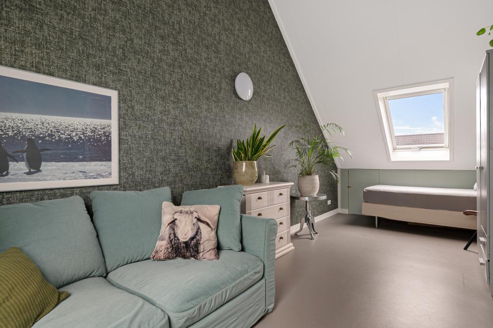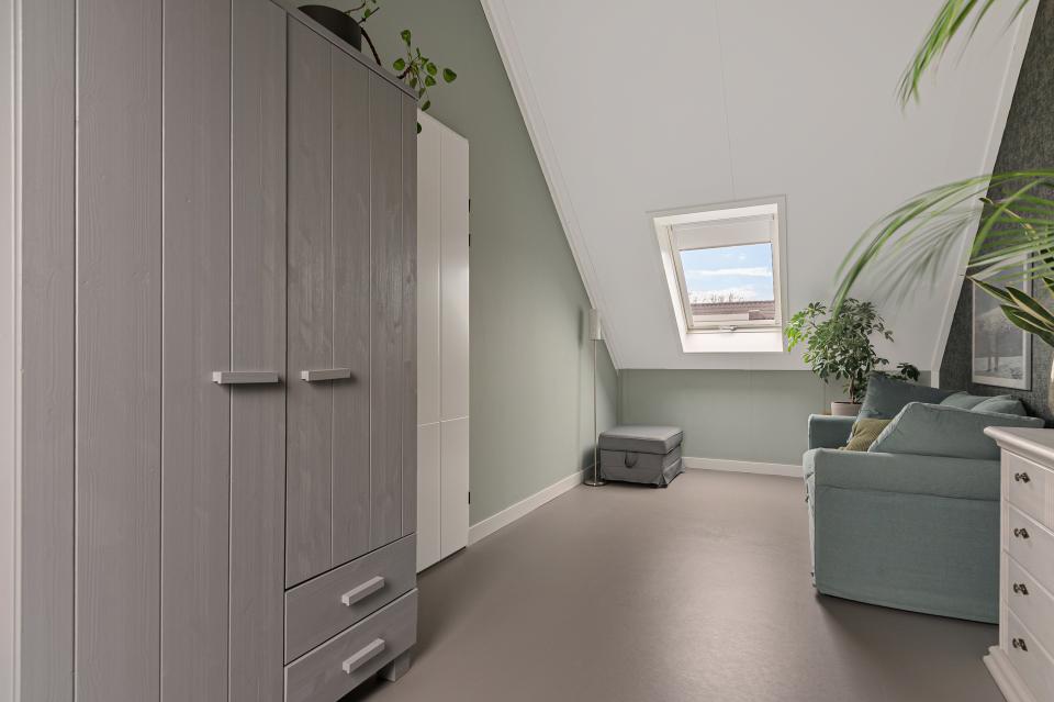 De zolder is praktisch ingedeeld met een ruime slaapkamer over de gehele lengte van de woning, voorzien van dakramen aan voor- en achterzijde. Ook deze ruimte is voorzien van linoleum en vloerverwarming.