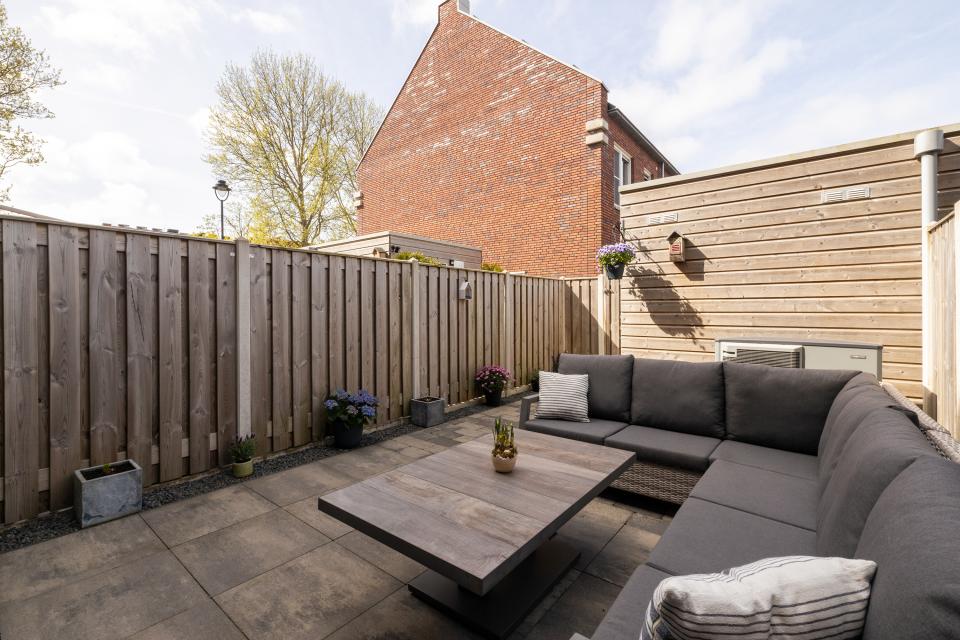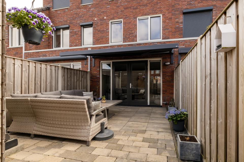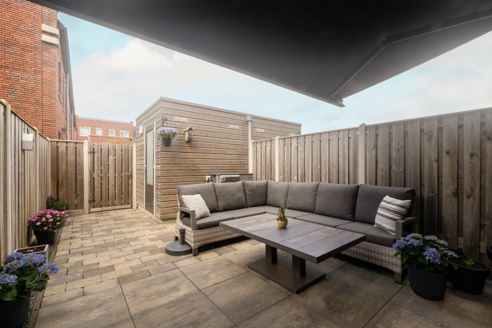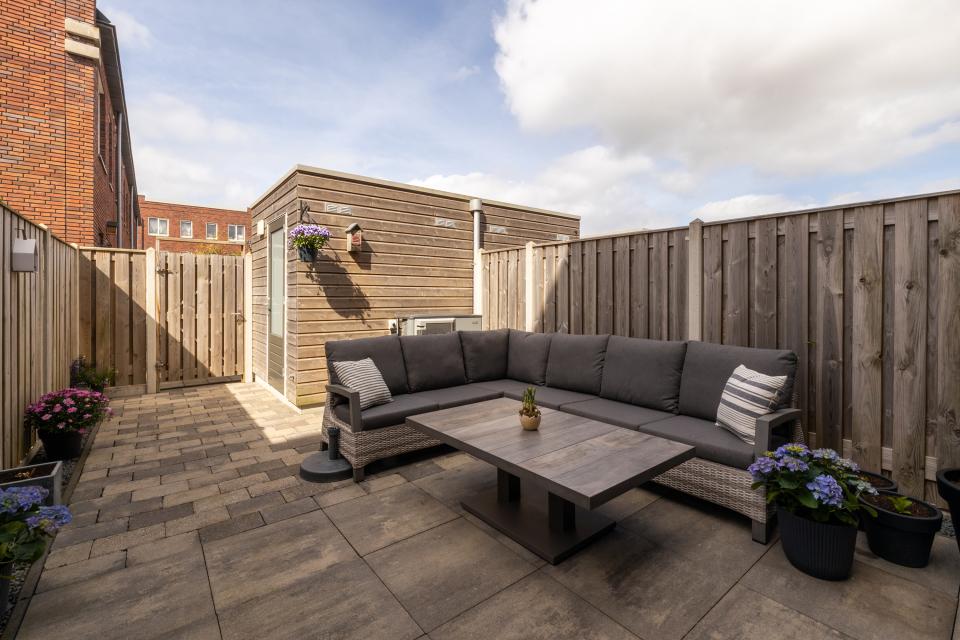Zonnige op het westen gelegen achtertuin. In de tuin bevindt zich de houten berging en de luchtwarmtepomp.