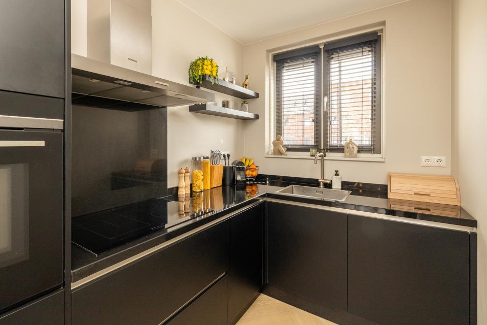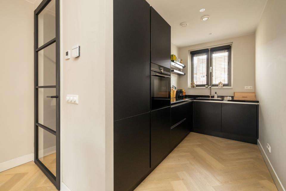 Aan de voorzijde van de woning bevindt zich de open, moderne keuken in hoekopstelling. Deze keuken is voorzien van diverse inbouwapparatuur zoals, elektrische kookplaat met fraaie RVS afzuigkap, combi magnetron, koelkast, vriezer en vaatwasser. In de kamer bevindt zich de trapkast met de boiler.