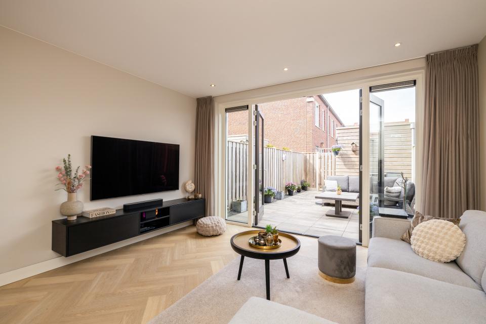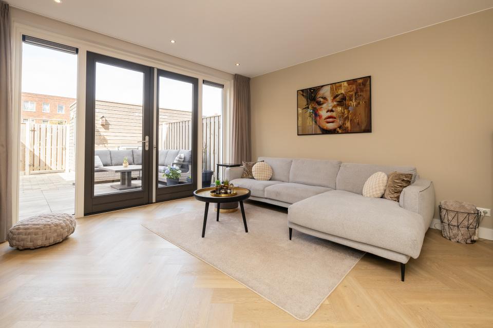 Entree met hal en meterkast. Modern vrij hangend toilet. Uitgebouwde woonkamer met openslaande deuren naar de op het westen gelegen achtertuin.