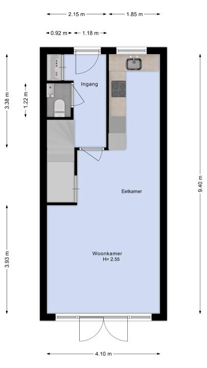 Begane grond:Entree met hal en meterkast. Modern vrij hangend toilet. Uitgebouwde woonkamer met openslaande deuren naar de op het westen gelegen achtertuin.