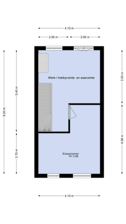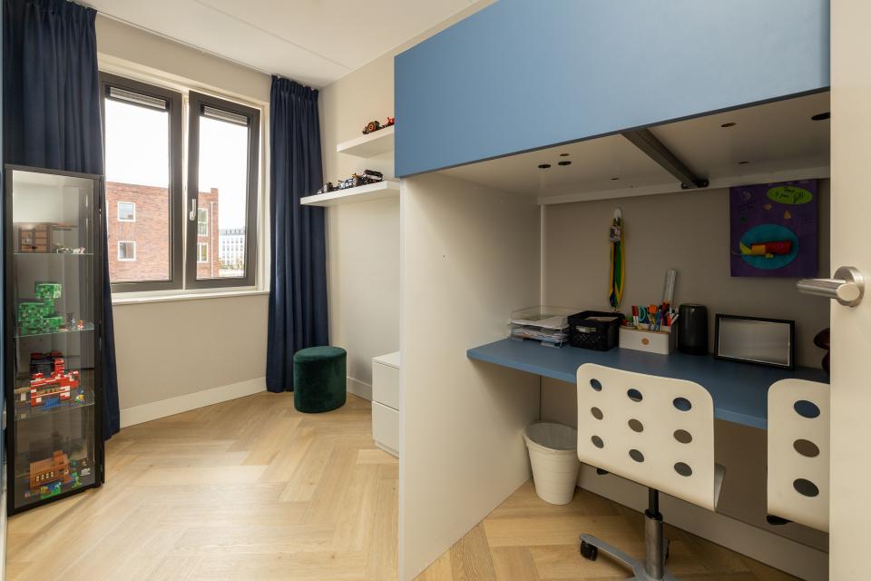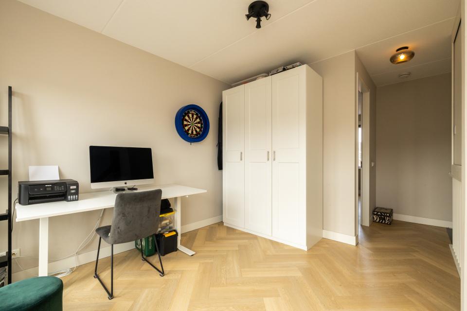Op deze verdieping is er aan de achterzijde de ruime ouderslaapkamer. De ramen zijn hier v.v. rolluiken. Aan de voorzijde, is er een open werk- hobbyruimte alsmede wasruimte.