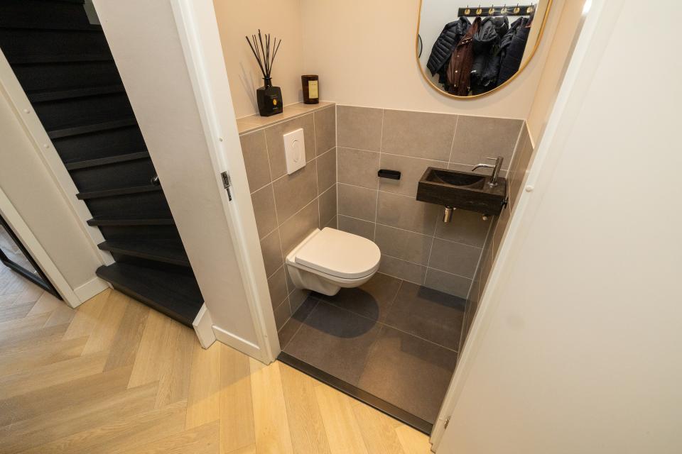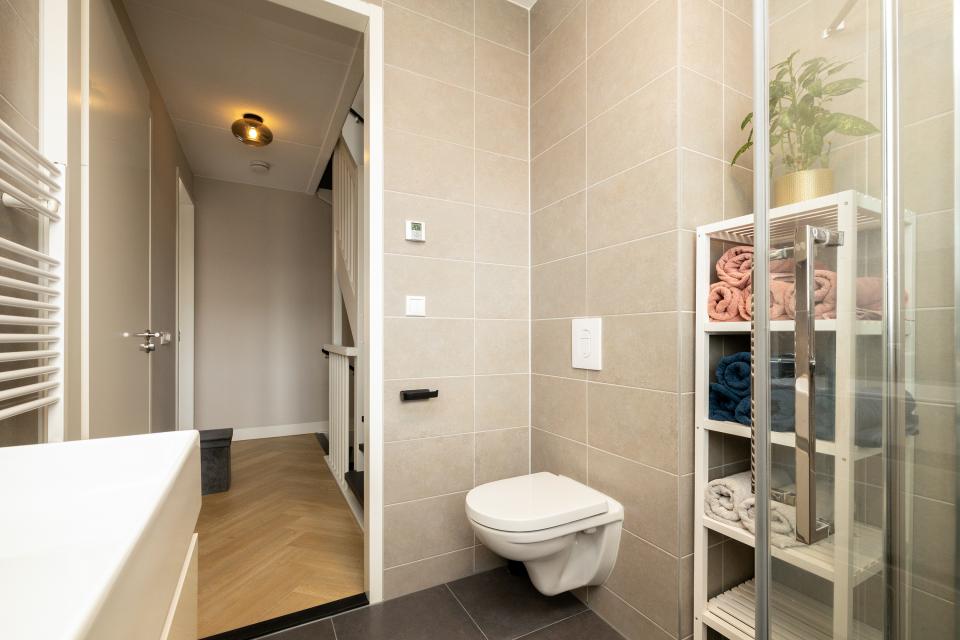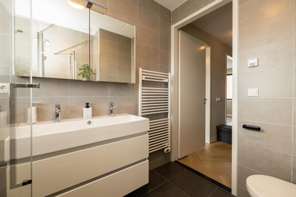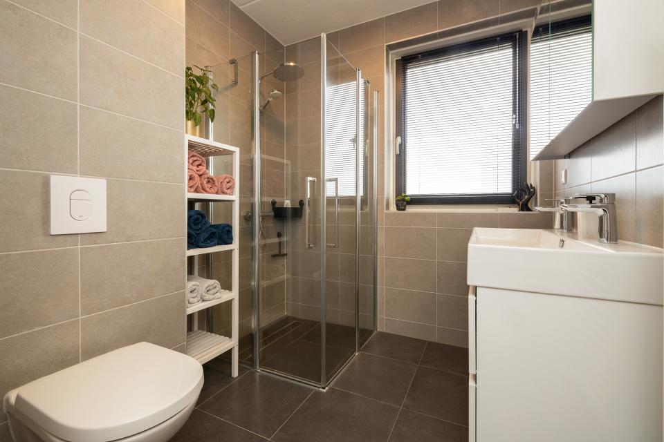 Eveneens aan de voorzijde is er de moderne badkamer met ruime inloopdouche, wastafelmeubel en 2e toilet.