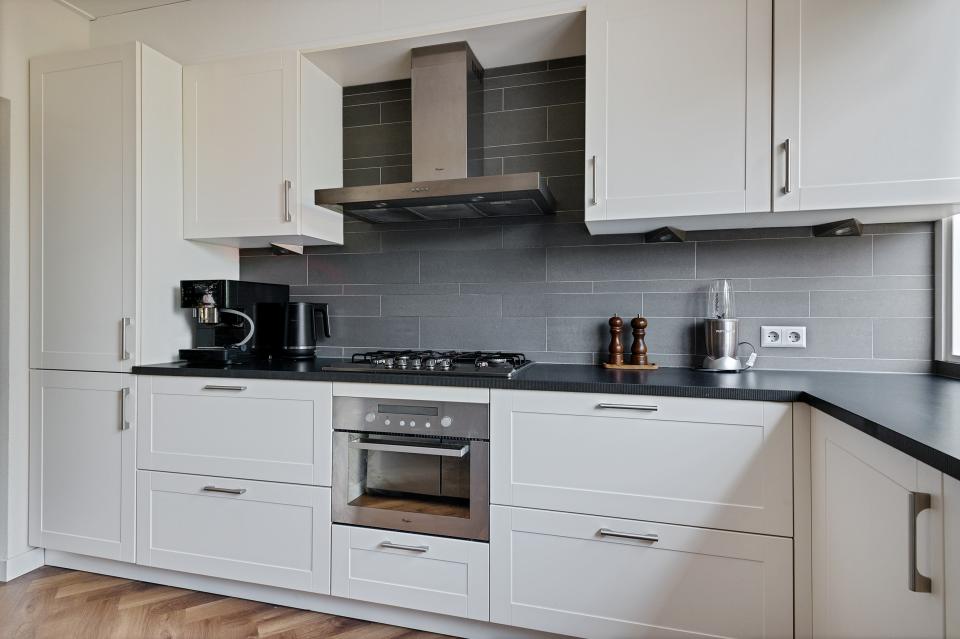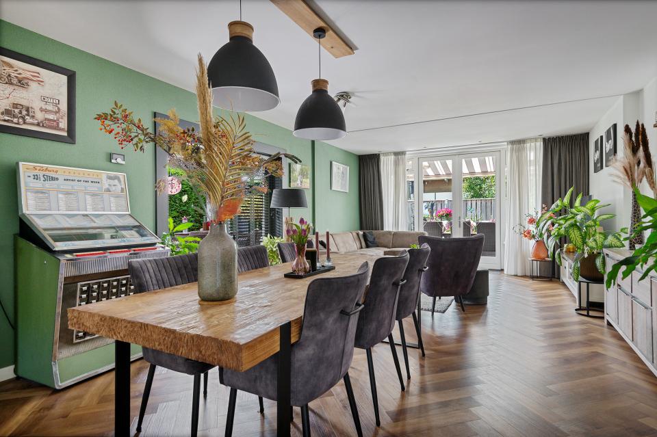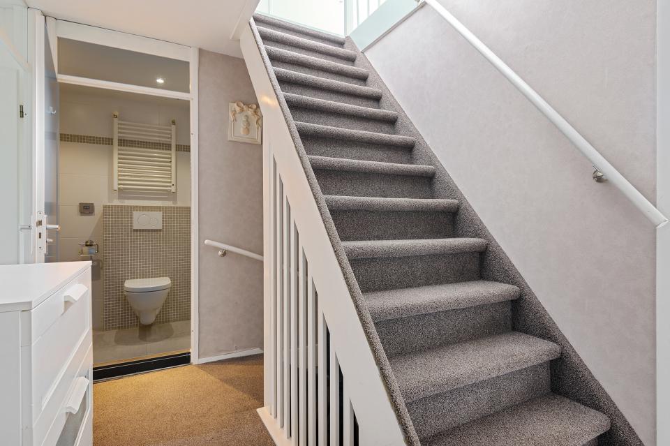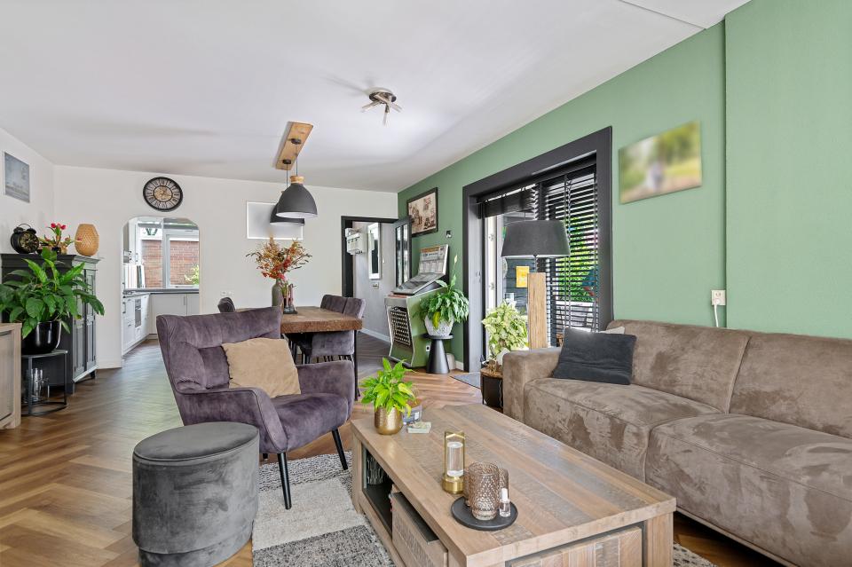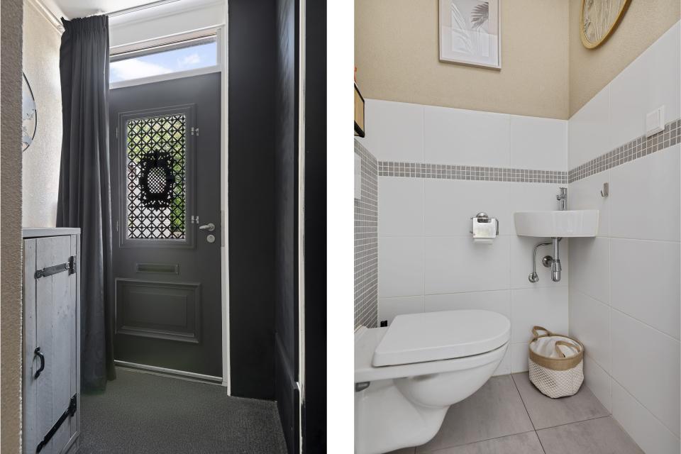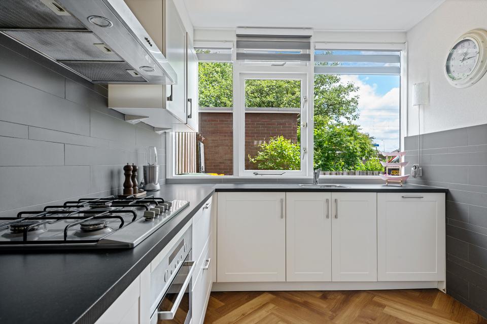 U komt binnen in de hal. De hal is voorzien van meterkast, trapopgang en een toiletruimte met vrij hangend toilet en een fonteintje. De uitgebouwde, lichte woonkamer is voorzien van een stijlvolle visgraat pvc vloer, openslaande deuren naar de achtertuin en openslaande deuren naar de sfeervolle veranda. Aan de voorzijde bevindt zich de L-vormige keuken met diverse inbouwapparatuur, te weten: 5-pitsgaskookplaat, combi oven/magnetron, RVS afzuigkap en koel-/vries combinatie.
