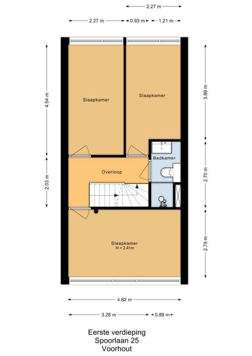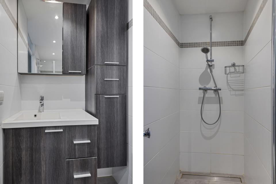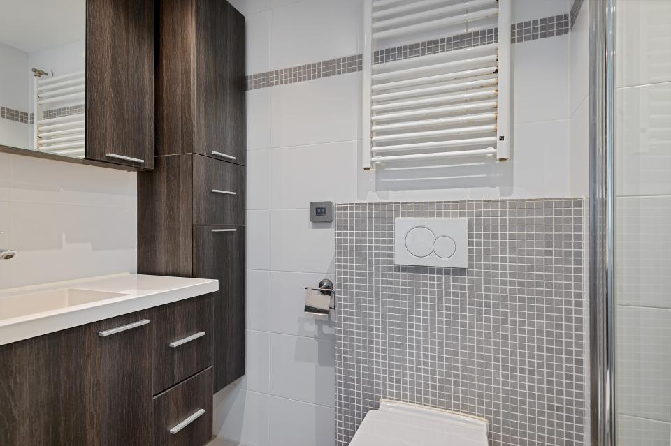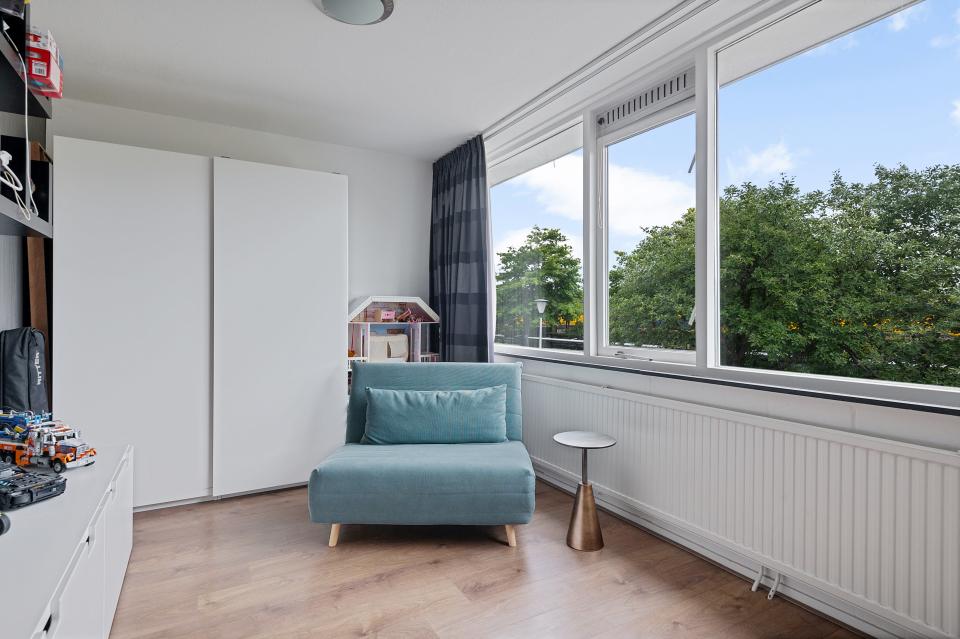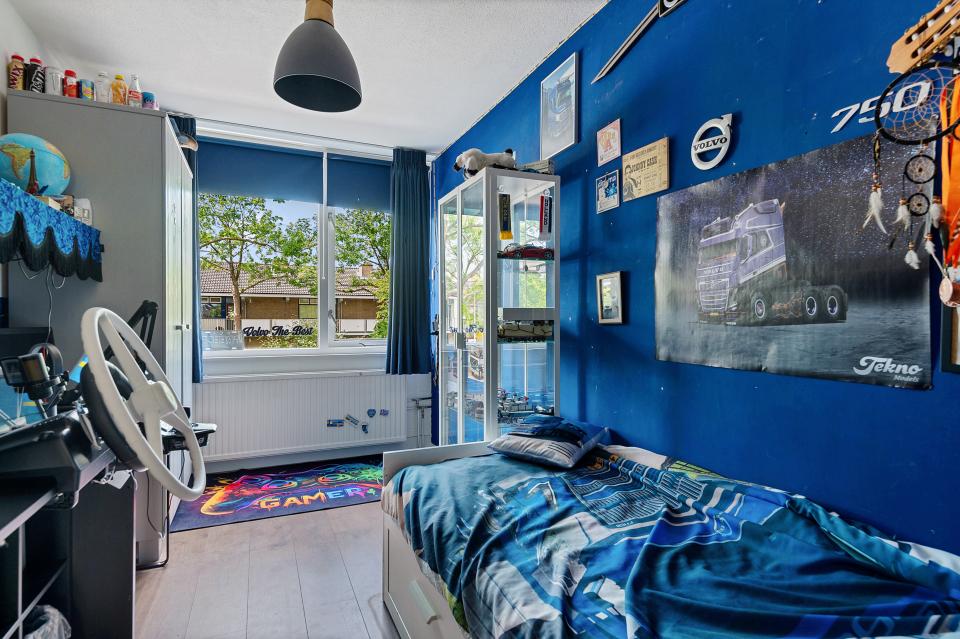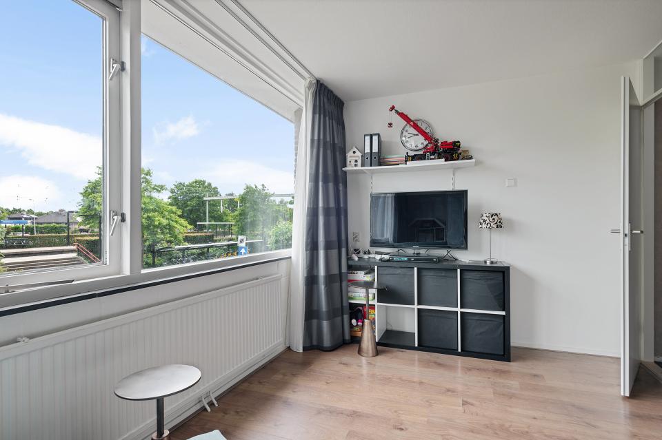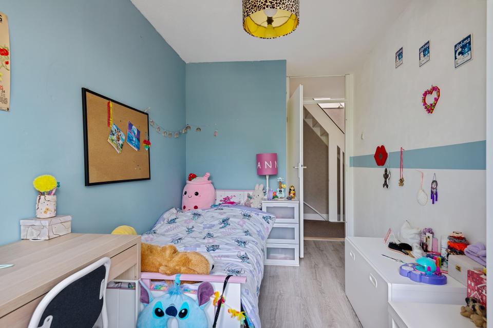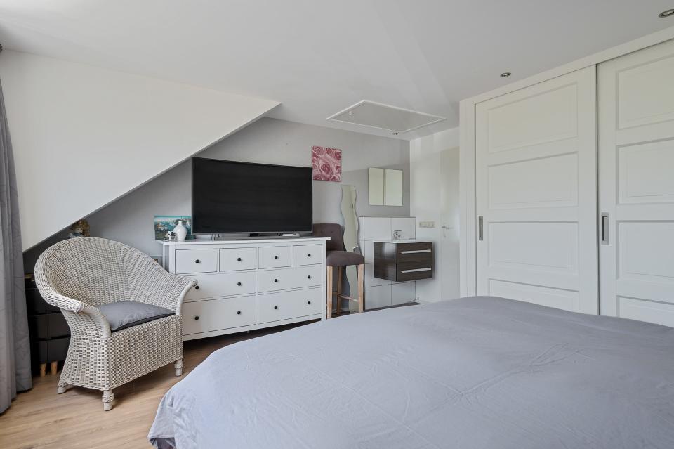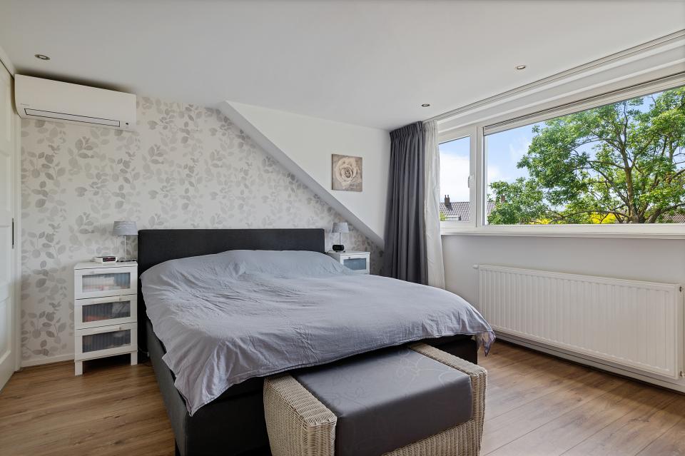 De ruime overloop is voorzien van airconditioning en biedt toegang tot drie slaapkamers en de badkamer. Aan de voorzijde bevindt zich, over de gehele breedte, een royale slaapkamer. De tweede en derde slaapkamer zijn gesitueerd aan de achterzijde van de woning. De centraal gelegen badkamer is uitgevoerd in een grijs-wit kleurstelling en is uitgerust met wastafelmeubel, spiegelkast, badkamerkast, vrij hangend toilet en douche.