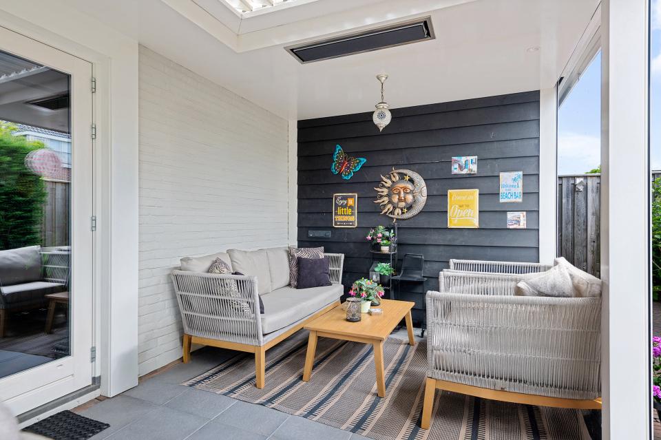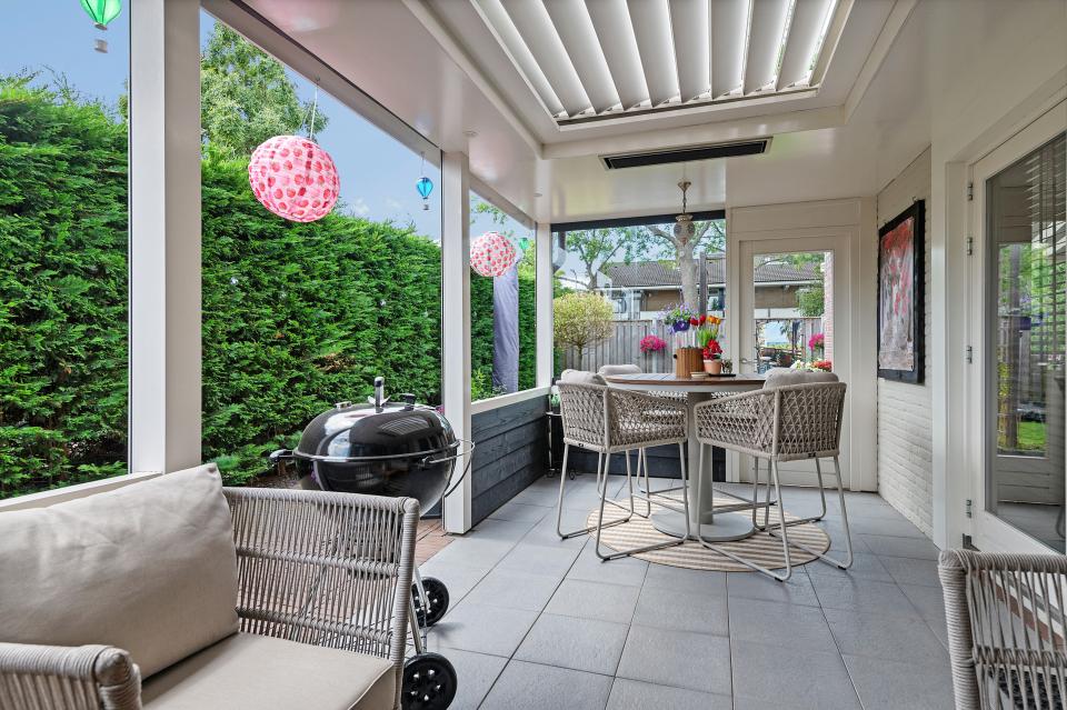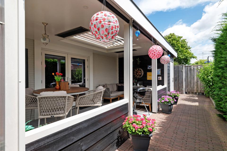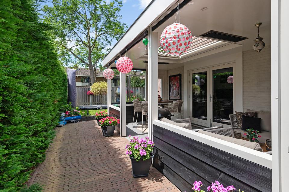 In de zijtuin bevindt zich een tweede berging én de luxe overkapping, een echte eyecatcher. Deze overkapping is voorzien van geïntegreerde infrarood heaters, screens en een lichtstraat met zonwering. Hierdoor is het een volwaardige buitenruimte waar u het hele jaar door kunt genieten.