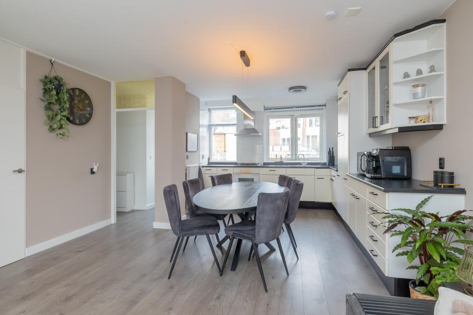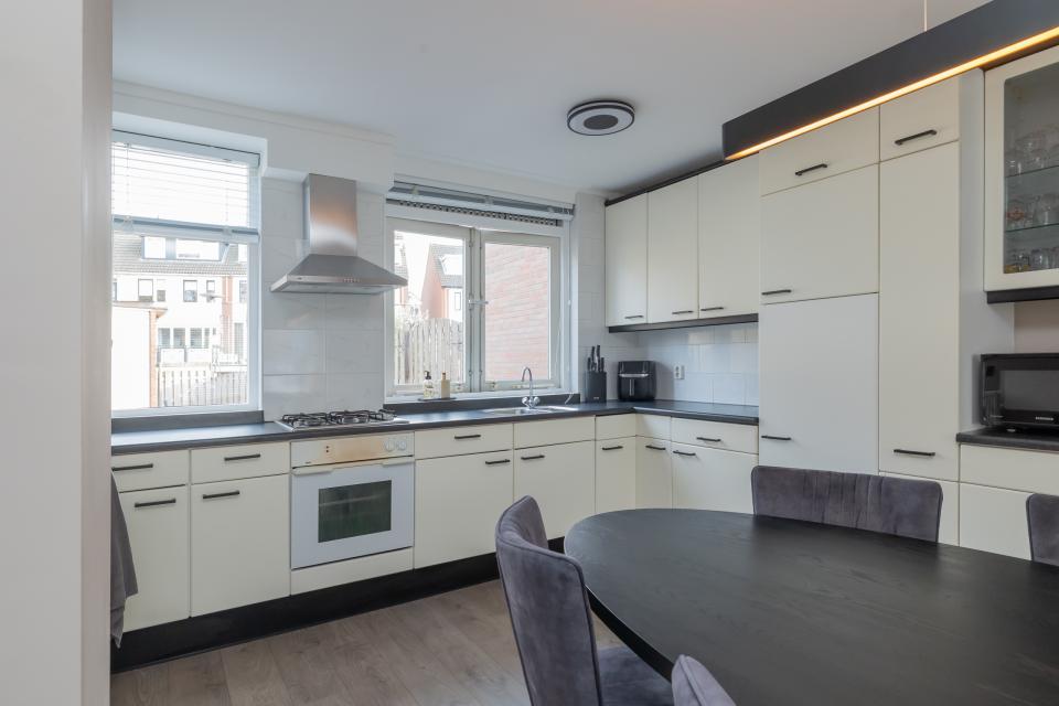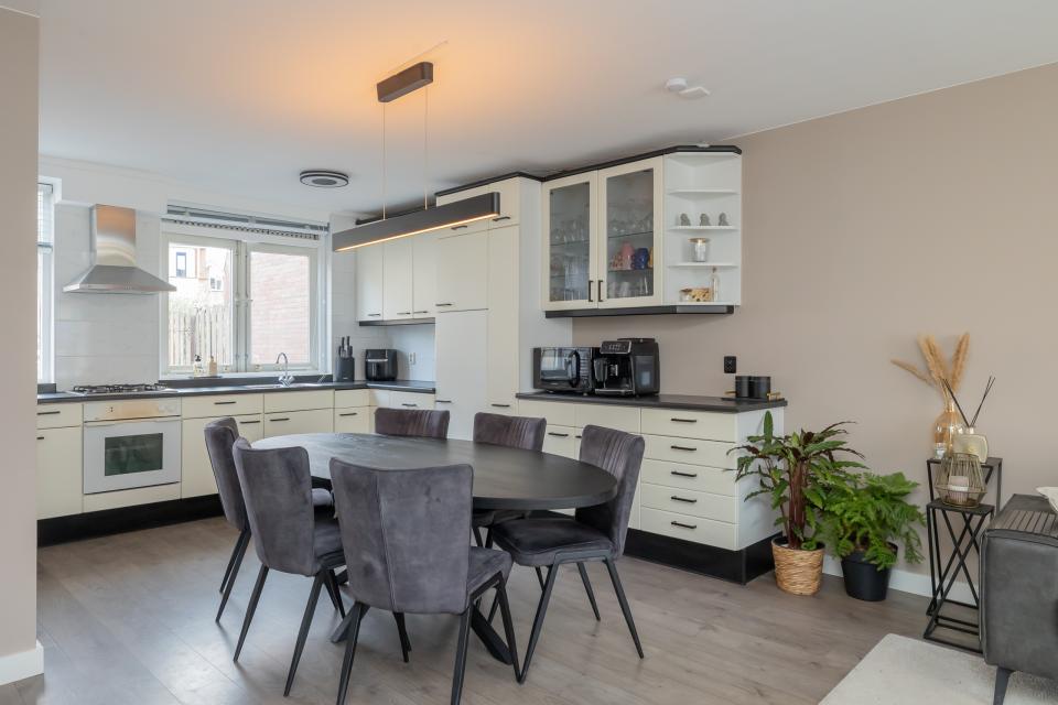 Aan de achterzijde bevindt zich de open keuken in L-vormige opstelling, voorzien van diverse inbouwapparatuur en met uitzicht op de achtertuin.