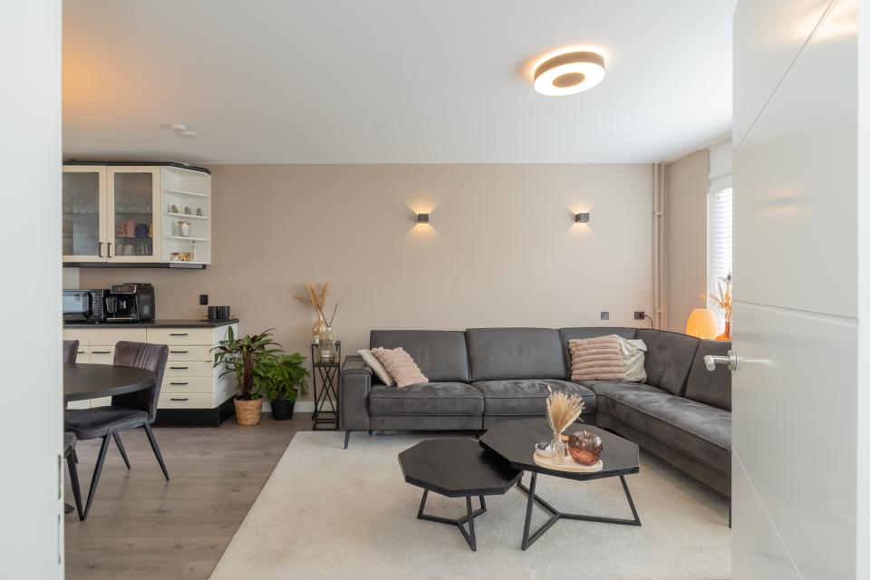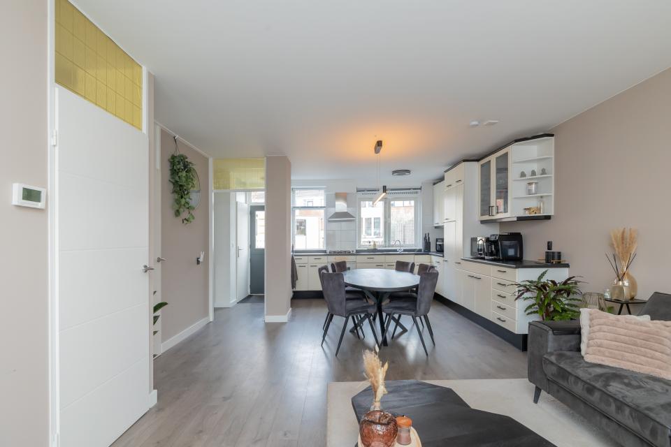 Via de entree met meterkast en trapkast betreedt u de lichte en sfeervolle woonkamer met grote raampartijen, waardoor er veel natuurlijk licht binnenvalt. De woonkamer heeft een verzorgde afwerking en een prettige indeling met voldoende ruimte voor een gezellige zit- en eethoek.Aan de achterzijde bevindt zich de open keuken in L-vormige opstelling, voorzien van diverse inbouwapparatuur en met uitzicht op de achtertuin.
