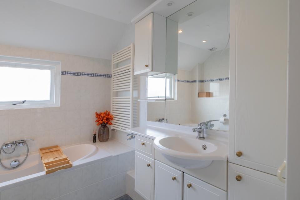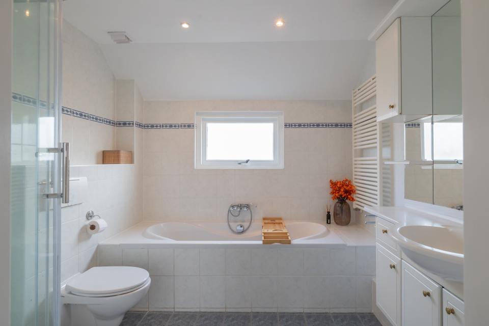 De eerste verdieping telt drie ruime slaapkamers, alle voorzien van veel lichtinval en een nette vloerafwerking. De badkamer is modern uitgevoerd en beschikt over een inloopdouche, tweede toilet, ligbad, wastafelmeubel en designradiator.Tweede verdieping